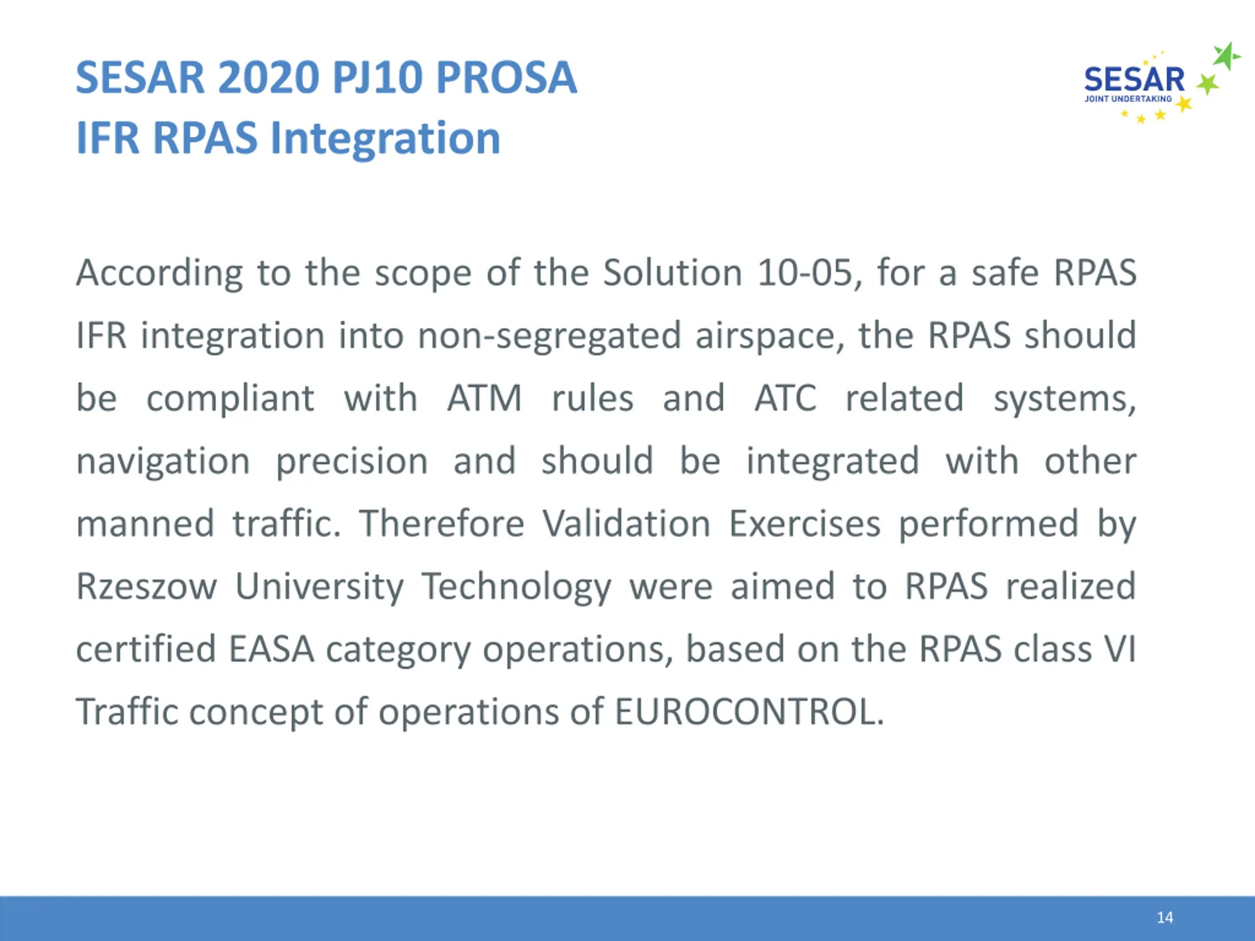 SESAR 2020 PJ10 PROSA IFR RPAS Integration According to the scope of the Solution 10-05, for a safe RPAS IFR integration into non-segregated airspace, the RPAS should be compliant with ATM rules and ATC related systems, navigation precision and should be integrated with other manned traffic. Therefore Validation Exercises performed by Rzeszow University Technology were aimed to RPAS realized certified EASA category operations, based on the RPAS class VI Traffic concept of operations of EUROCONTROL. 14