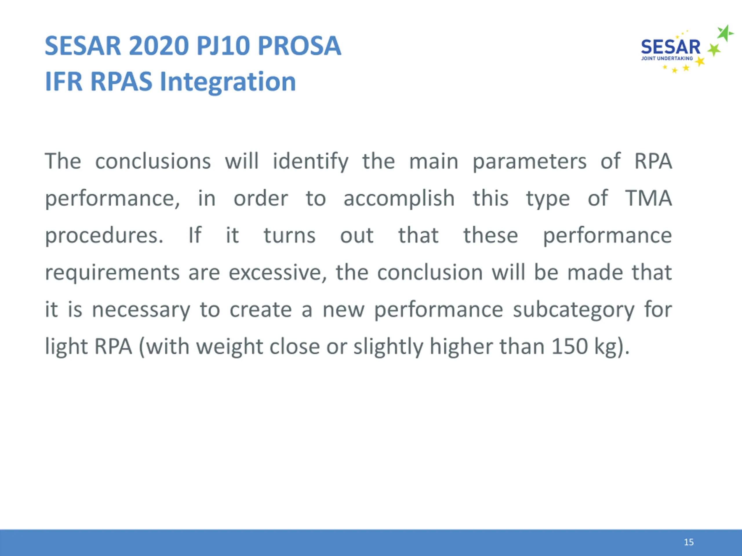 SESAR 2020 PJ10 PROSA IFR RPAS Integration The conclusions will identify the main parameters of RPA performance, in order to accomplish this type of TMA procedures. If it turns out that these performance requirements are excessive, the conclusion will be made that it is necessary to create a new performance subcategory for light RPA (with weight close or slightly higher than 150 kg). 15