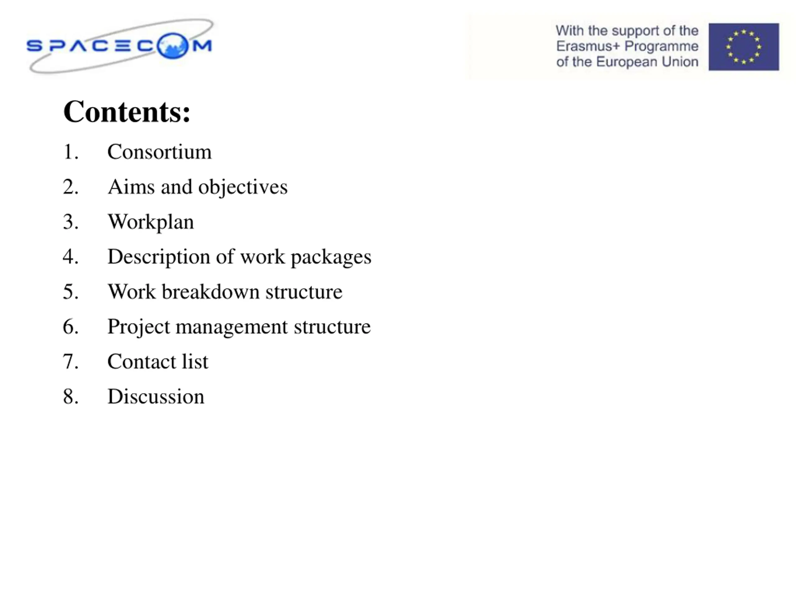 Contents: 1. Consortium 2. Aims and objectives 3. Workplan 4. Description of work packages 5. Work breakdown structure 6. Project management structure 7. Contact list 8. Discussion