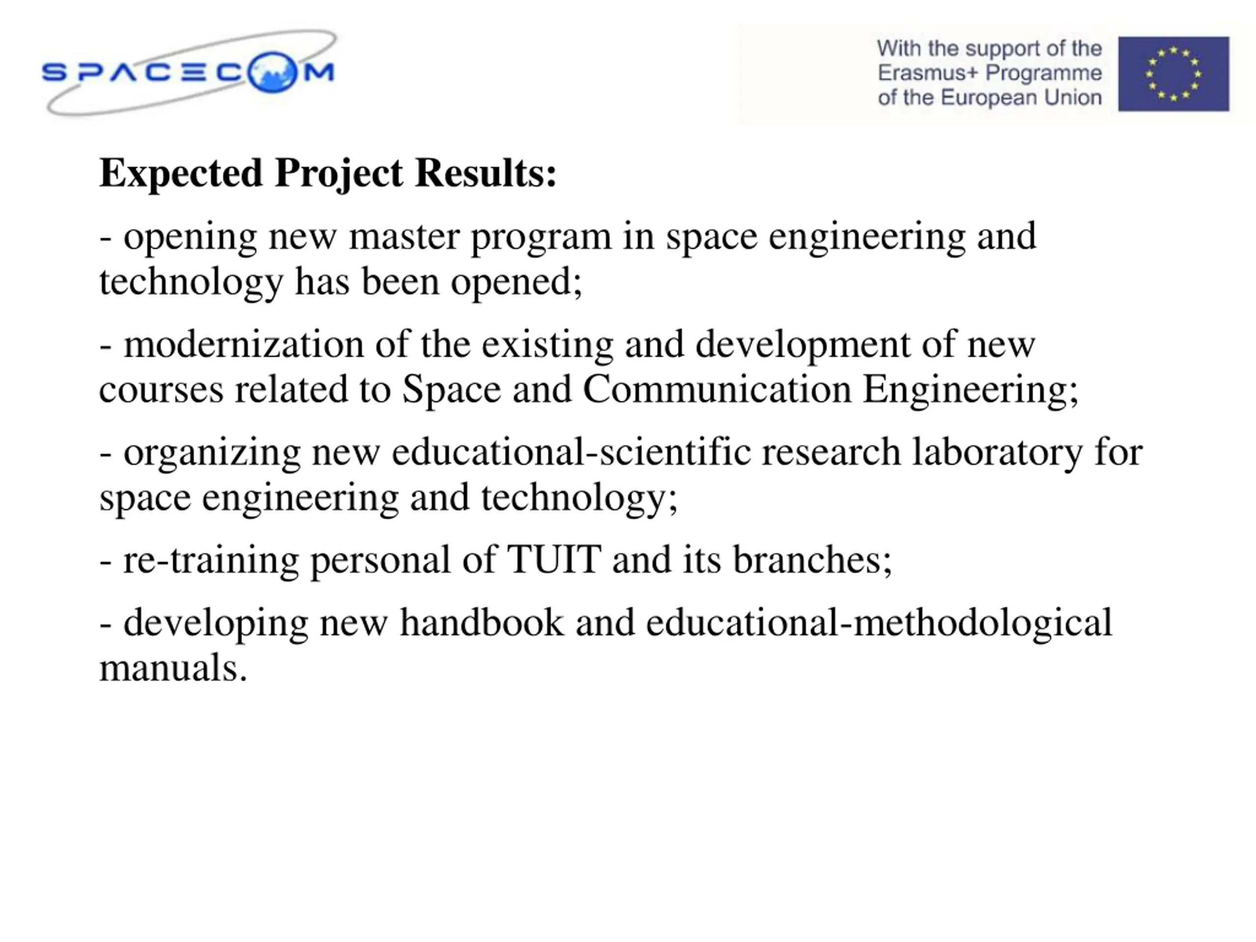 Expected Project Results: - opening new master program in space engineering and technology has been opened; - modernization of the existing and development of new courses related to Space and Communication Engineering; - organizing new educational-scientific research laboratory for space engineering and technology; - re-training personal of TUIT and its branches; - developing new handbook and educational-methodological manuals.