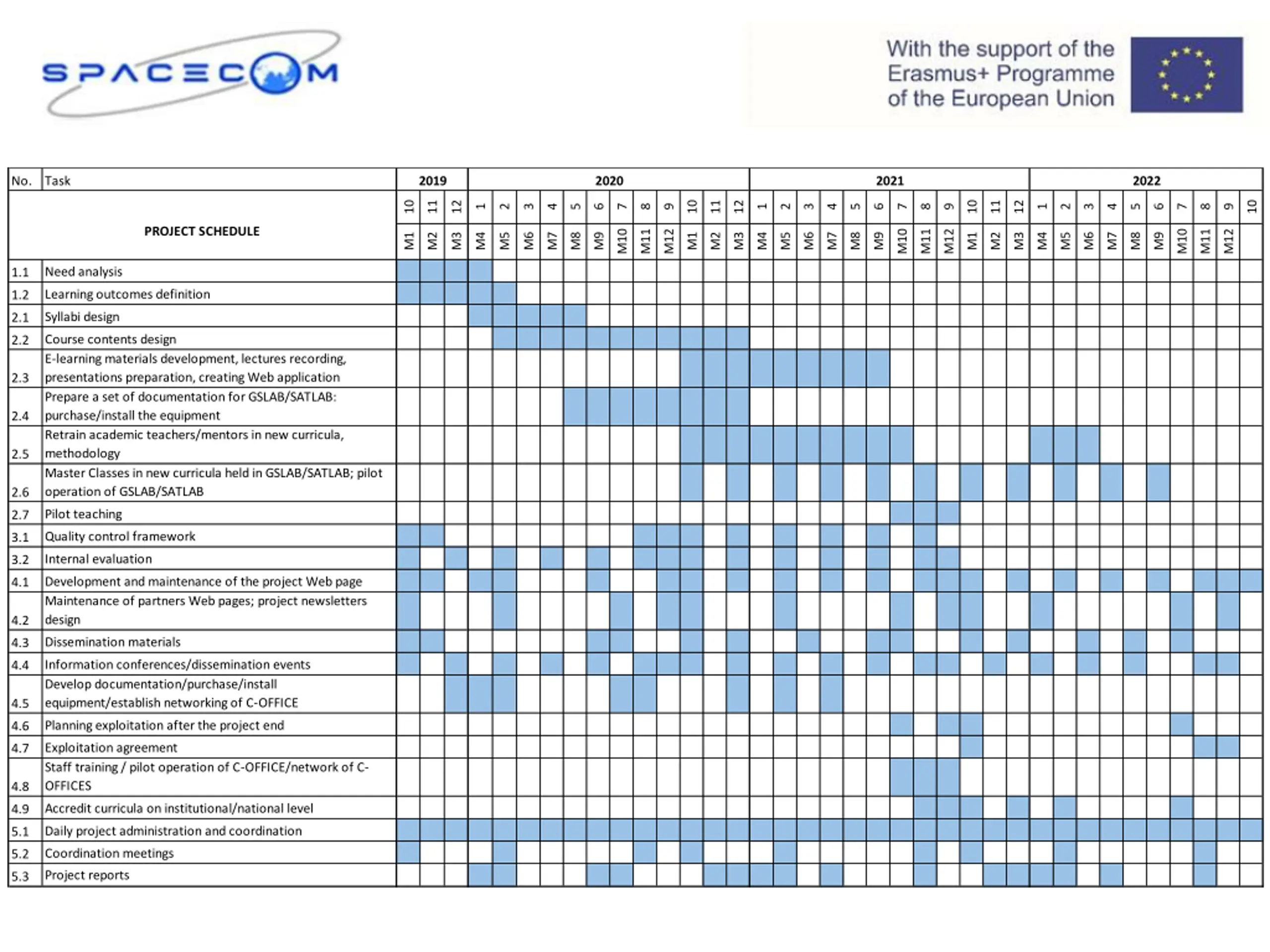 No. Task 2019 2020 2021 2022 10 11 12 10 11 12 10 11 12 10 1 2 3 4 5 6 7 8 9 1 2 3 4 5 6 7 8 9 1 2 3 4 5 6 7 8 9 PROJECT SCHEDULE M10 M11 M12 M10 M11 M12 M10 M11 M12 M1 M2 M3 M4 M5 M6 M7 M8 M9 M1 M2 M3 M4 M5 M6 M7 M8 M9 M1 M2 M3 M4 M5 M6 M7 M8 M9 Need analysis 1.1 Learning outcomes definition 1.2 Syllabi design 2.1 Course contents design E-learning materials development, lectures recording, presentations preparation, creating Web application Prepare a set of documentation for GSLAB/SATLAB: purchase/install the equipment Retrain academic teachers/mentors in new curricula, methodology Master Classes in new curricula held in GSLAB/SATLAB; pilot operation of GSLAB/SATLAB 2.2 2.3 2.4 2.5 2.6 Pilot teaching 2.7 Quality control framework 3.1 Internal evaluation 3.2 Development and maintenance of the project Web page Maintenance of partners Web pages; project newsletters design 4.1 4.2 Dissemination materials 4.3 Information conferences/dissemination events Develop documentation/purchase/install equipment/establish networking of C-OFFICE 4.4 4.5 Planning exploitation after the project end 4.6 Exploitation agreement Staff training / pilot operation of C-OFFICE/network of C- OFFICES 4.7 4.8 Accredit curricula on institutional/national level 4.9 Daily project administration and coordination 5.1 Coordination meetings 5.2 Project reports 5.3