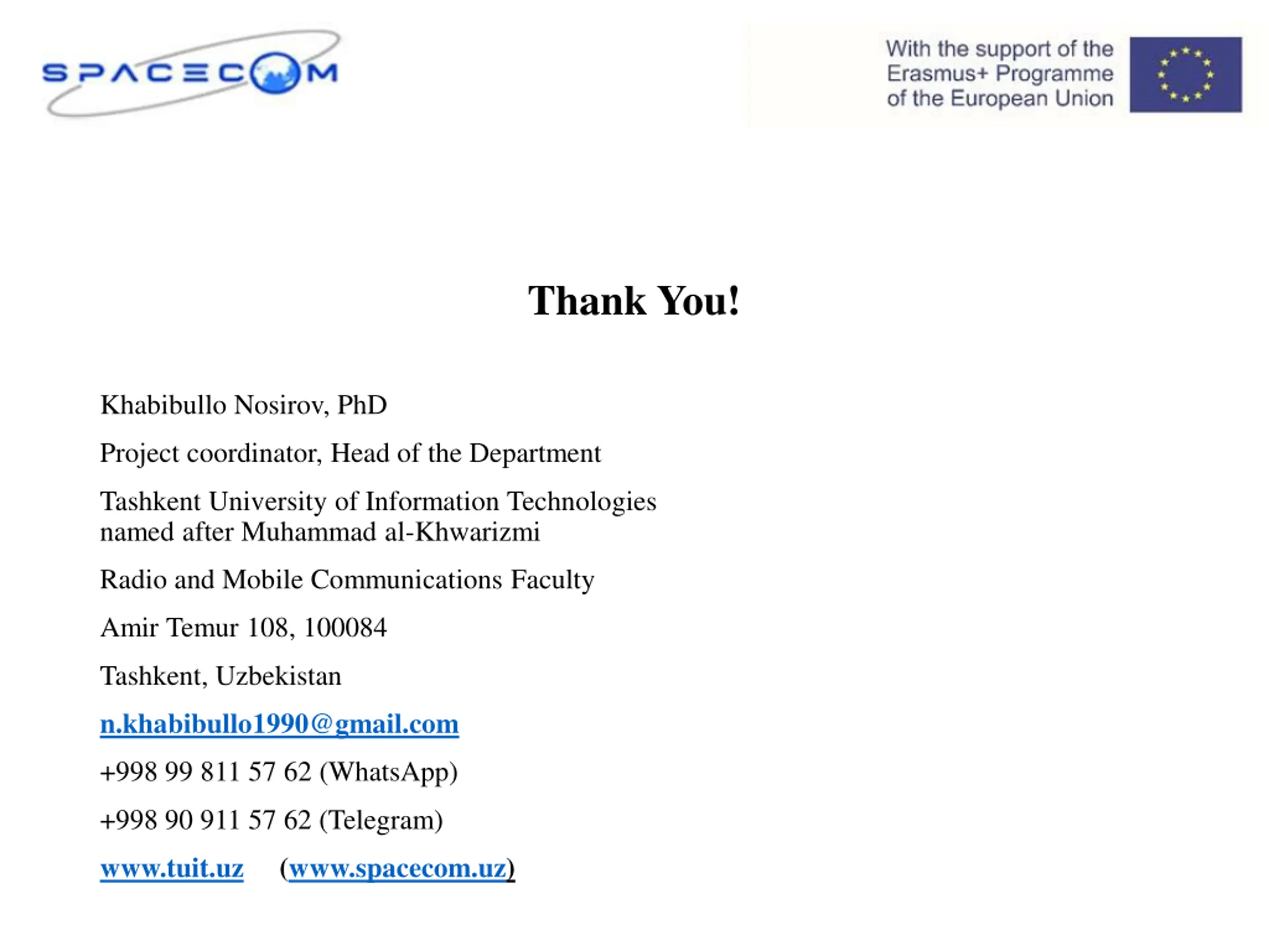 Thank You! Khabibullo Nosirov, PhD Project coordinator, Head of the Department Tashkent University of Information Technologies named after Muhammad al-Khwarizmi Radio and Mobile Communications Faculty Amir Temur 108, 100084 Tashkent, Uzbekistan n.khabibullo1990@gmail.com +998 99 811 57 62 (WhatsApp) +998 90 911 57 62 (Telegram) www.tuit.uz (www.spacecom.uz)