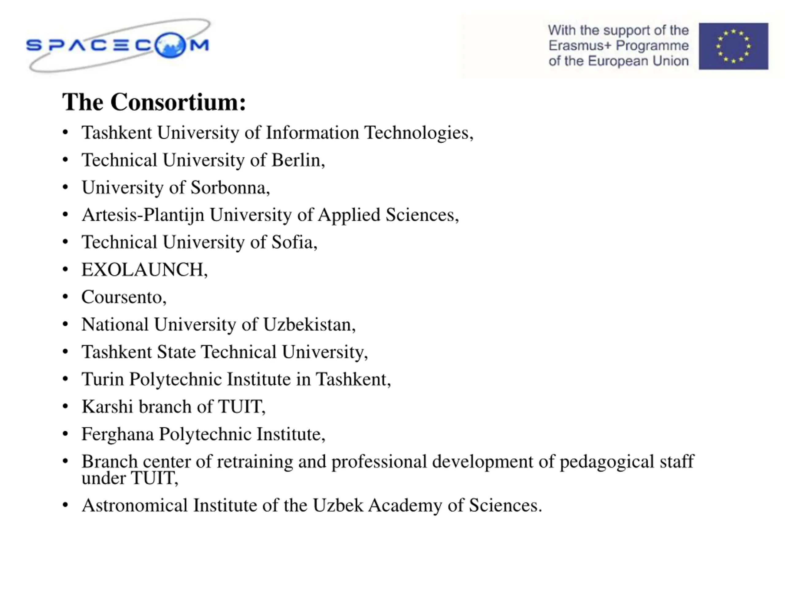 The Consortium: Tashkent University of Information Technologies, Technical University of Berlin, University of Sorbonna, Artesis-Plantijn University of Applied Sciences, Technical University of Sofia, EXOLAUNCH, Coursento, National University of Uzbekistan, Tashkent State Technical University, Turin Polytechnic Institute in Tashkent, Karshi branch of TUIT, Ferghana Polytechnic Institute, Branch center of retraining and professional development of pedagogical staff under TUIT, Astronomical Institute of the Uzbek Academy of Sciences.