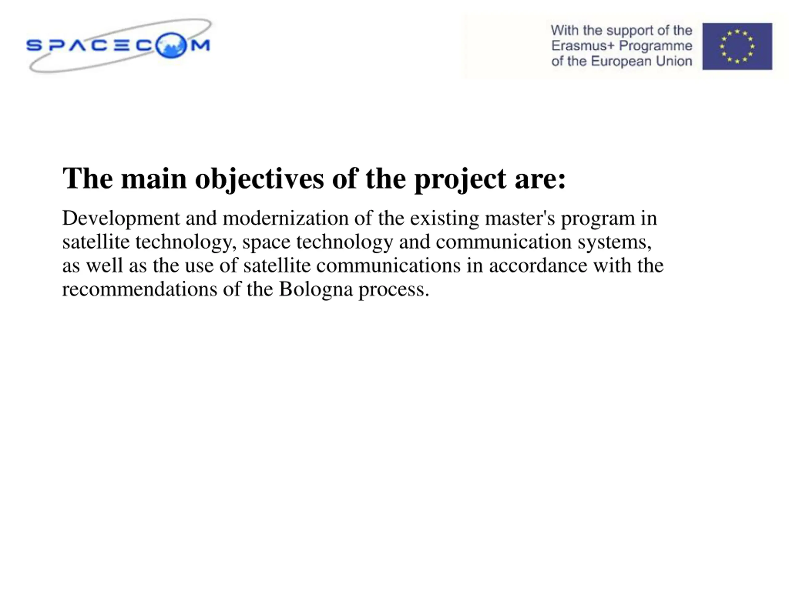The main objectives of the project are: Development and modernization of the existing master's program in satellite technology, space technology and communication systems, as well as the use of satellite communications in accordance with the recommendations of the Bologna process.