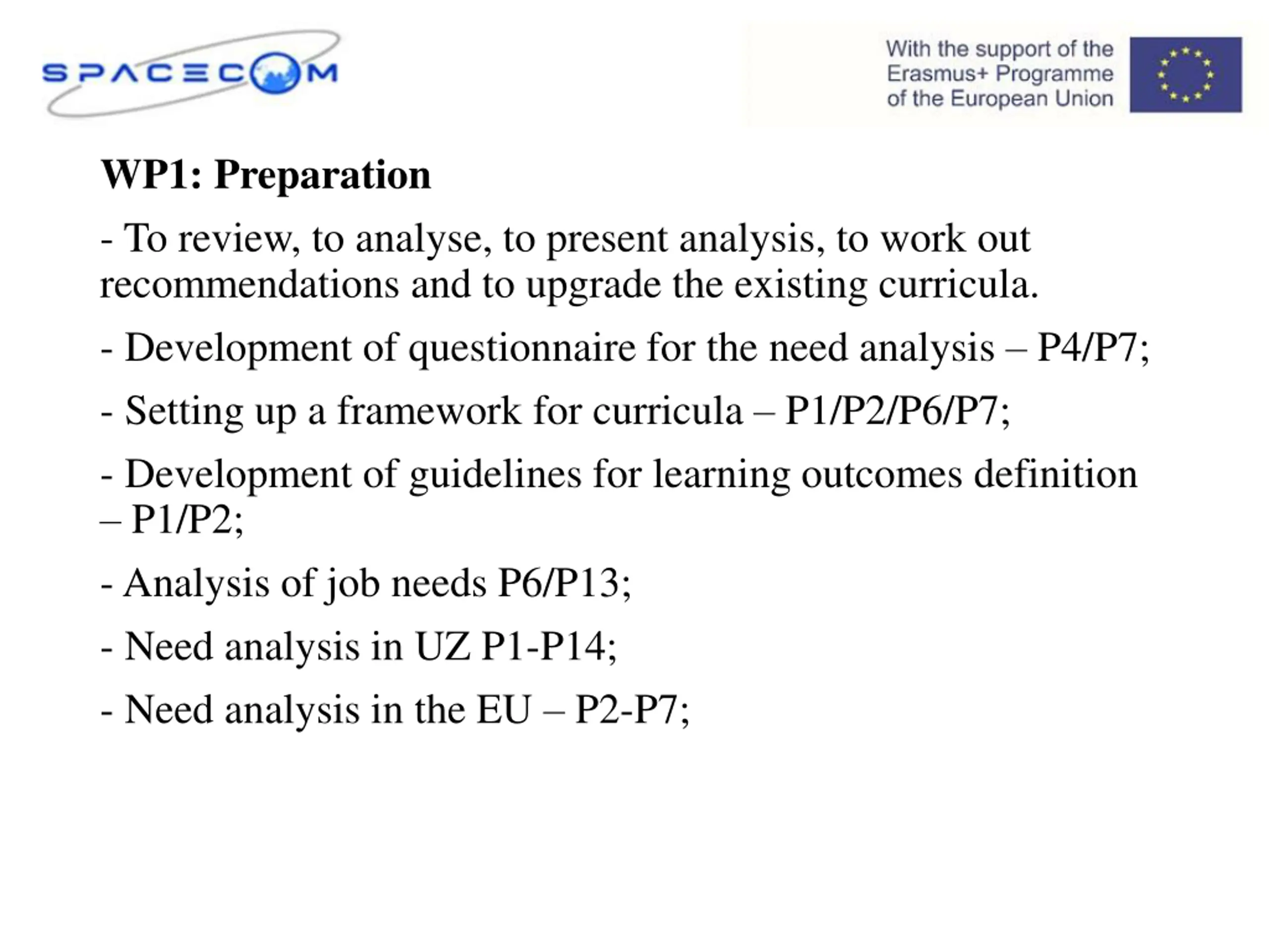WP1: Preparation - To review, to analyse, to present analysis, to work out recommendations and to upgrade the existing curricula. - Development of questionnaire for the need analysis P4/P7; - Setting up a framework for curricula P1/P2/P6/P7; - Development of guidelines for learning outcomes definition P1/P2; -Analysis of job needs P6/P13; - Need analysis in UZ P1-P14; - Need analysis in the EU P2-P7;