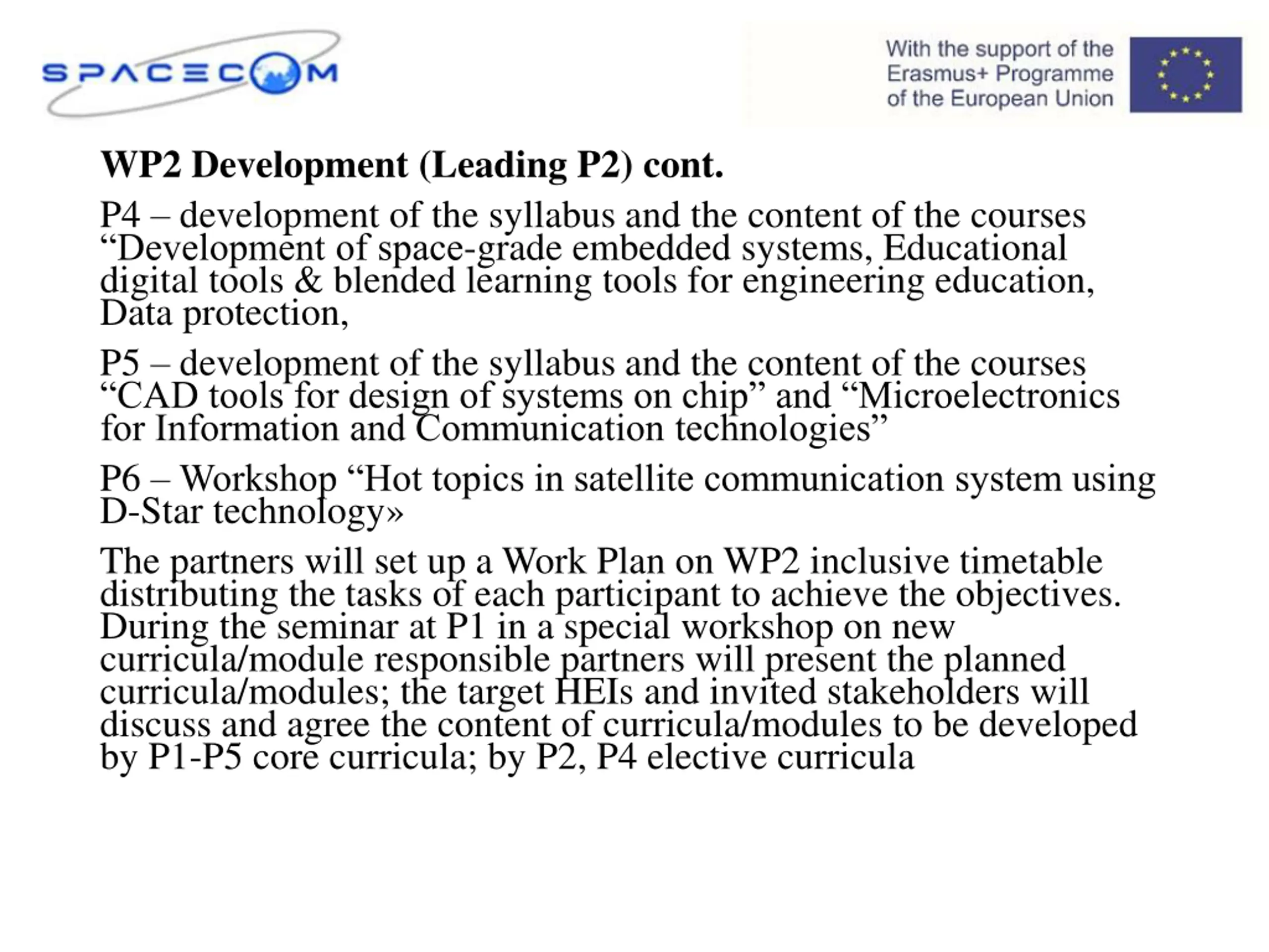 WP2 Development (Leading P2) cont. P4 development of the syllabus and the content of the courses Development of space-grade embedded systems, Educational digital tools & blended learning tools for engineering education, Data protection, P5 development of the syllabus and the content of the courses CAD tools for design of systems on chip and Microelectronics for Information and Communication technologies P6 Workshop Hot topics in satellite communication system using D-Star technology The partners will set up a Work Plan on WP2 inclusive timetable distributing the tasks of each participant to achieve the objectives. During the seminar at P1 in a special workshop on new curricula/module responsible partners will present the planned curricula/modules; the target HEIs and invited stakeholders will discuss and agree the content of curricula/modules to be developed by P1-P5 core curricula; by P2, P4 elective curricula