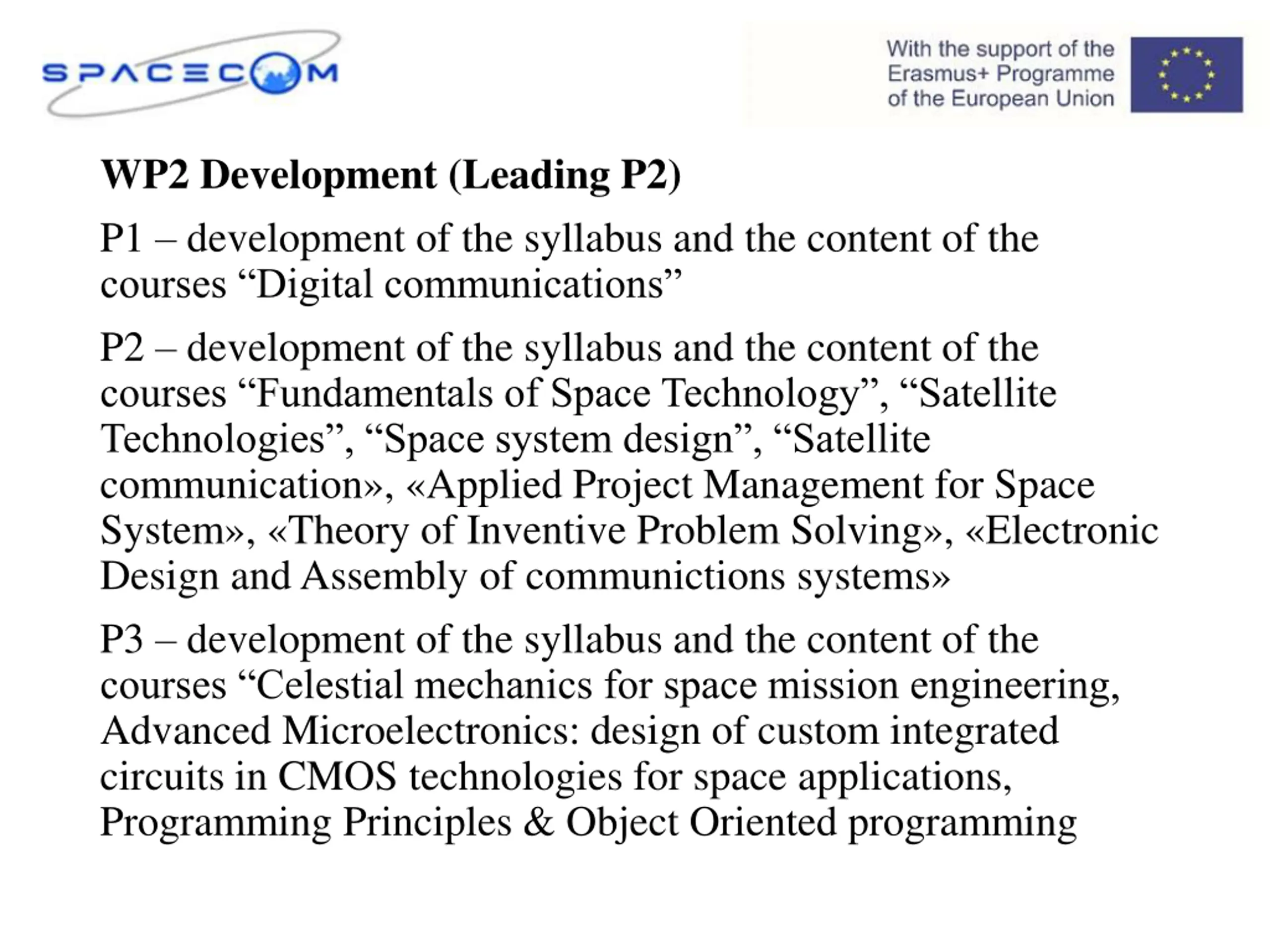 WP2 Development (Leading P2) P1 development of the syllabus and the content of the courses Digital communications P2 development of the syllabus and the content of the courses Fundamentals of Space Technology , Satellite Technologies , Space system design , Satellite communication , Applied Project Management for Space System , Theory of Inventive Problem Solving , Electronic Design and Assembly of communictions systems P3 development of the syllabus and the content of the courses Celestial mechanics for space mission engineering, Advanced Microelectronics: design of custom integrated circuits in CMOS technologies for space applications, Programming Principles & Object Oriented programming
