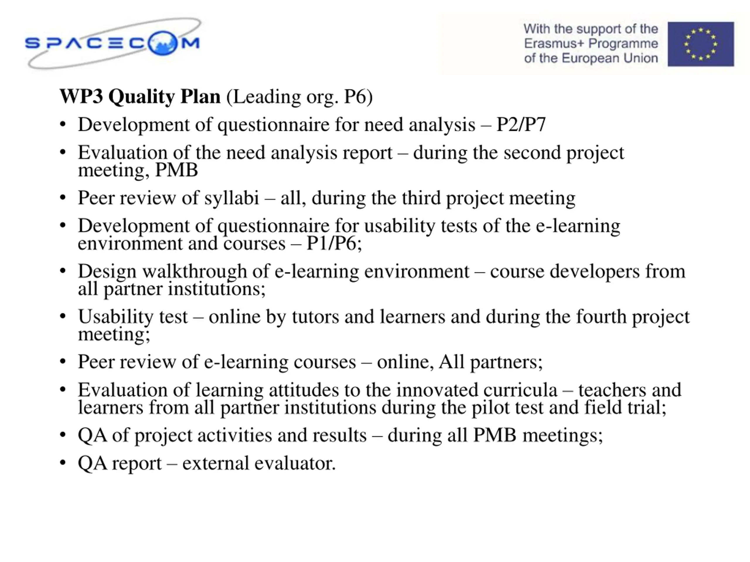 WP3 Quality Plan (Leading org. P6) Development of questionnaire for need analysis P2/P7 Evaluation of the need analysis report during the second project meeting, PMB Peer review of syllabi all, during the third project meeting Development of questionnaire for usability tests of the e-learning environment and courses P1/P6; Design walkthrough of e-learning environment course developers from all partner institutions; Usability test online by tutors and learners and during the fourth project meeting; Peer review of e-learning courses online, All partners; Evaluation of learning attitudes to the innovated curricula teachers and learners from all partner institutions during the pilot test and field trial; QA of project activities and results during all PMB meetings; QA report external evaluator.