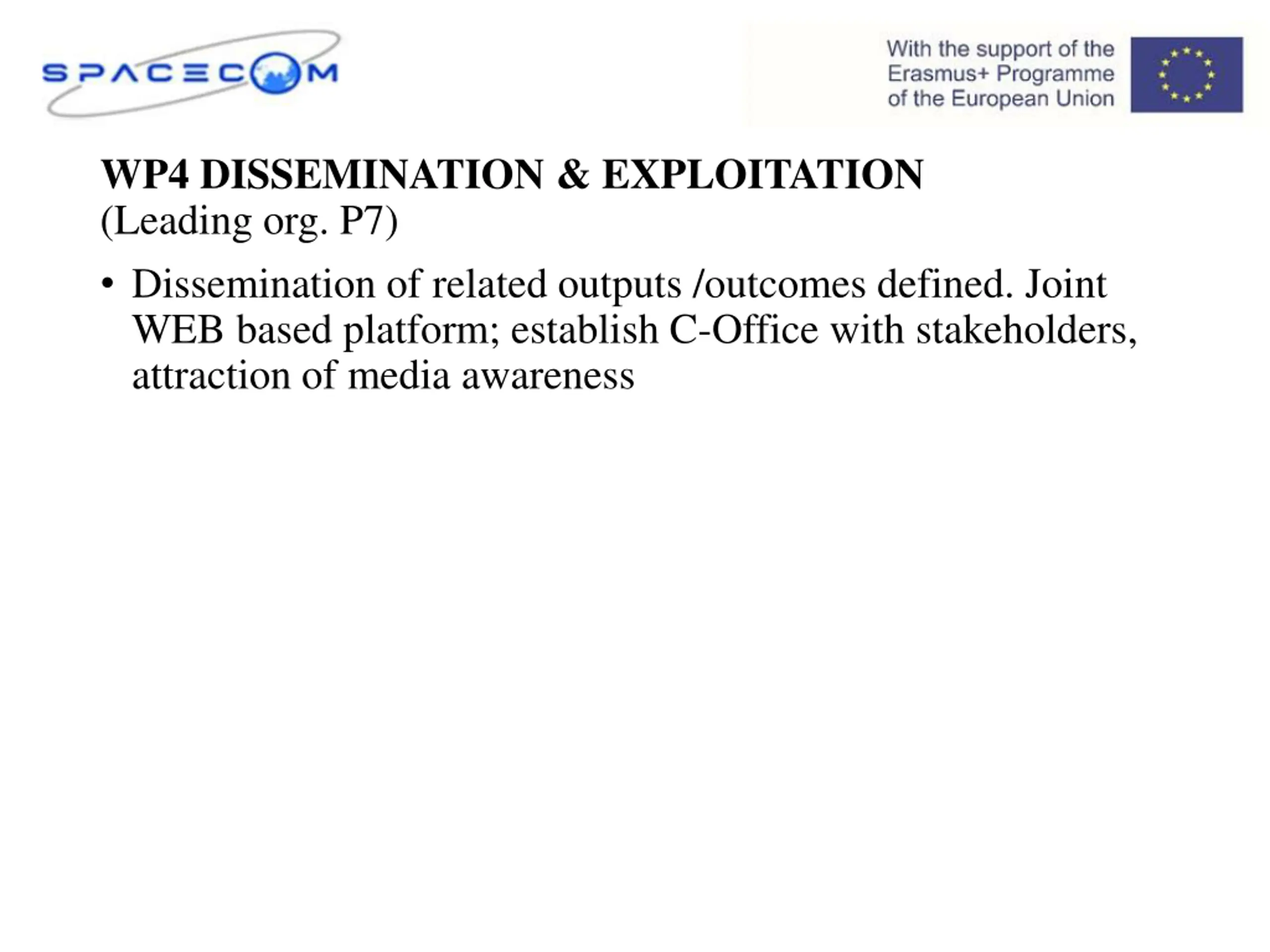 WP4 DISSEMINATION & EXPLOITATION (Leading org. P7) Dissemination of related outputs /outcomes defined. Joint WEB based platform; establish C-Office with stakeholders, attraction of media awareness