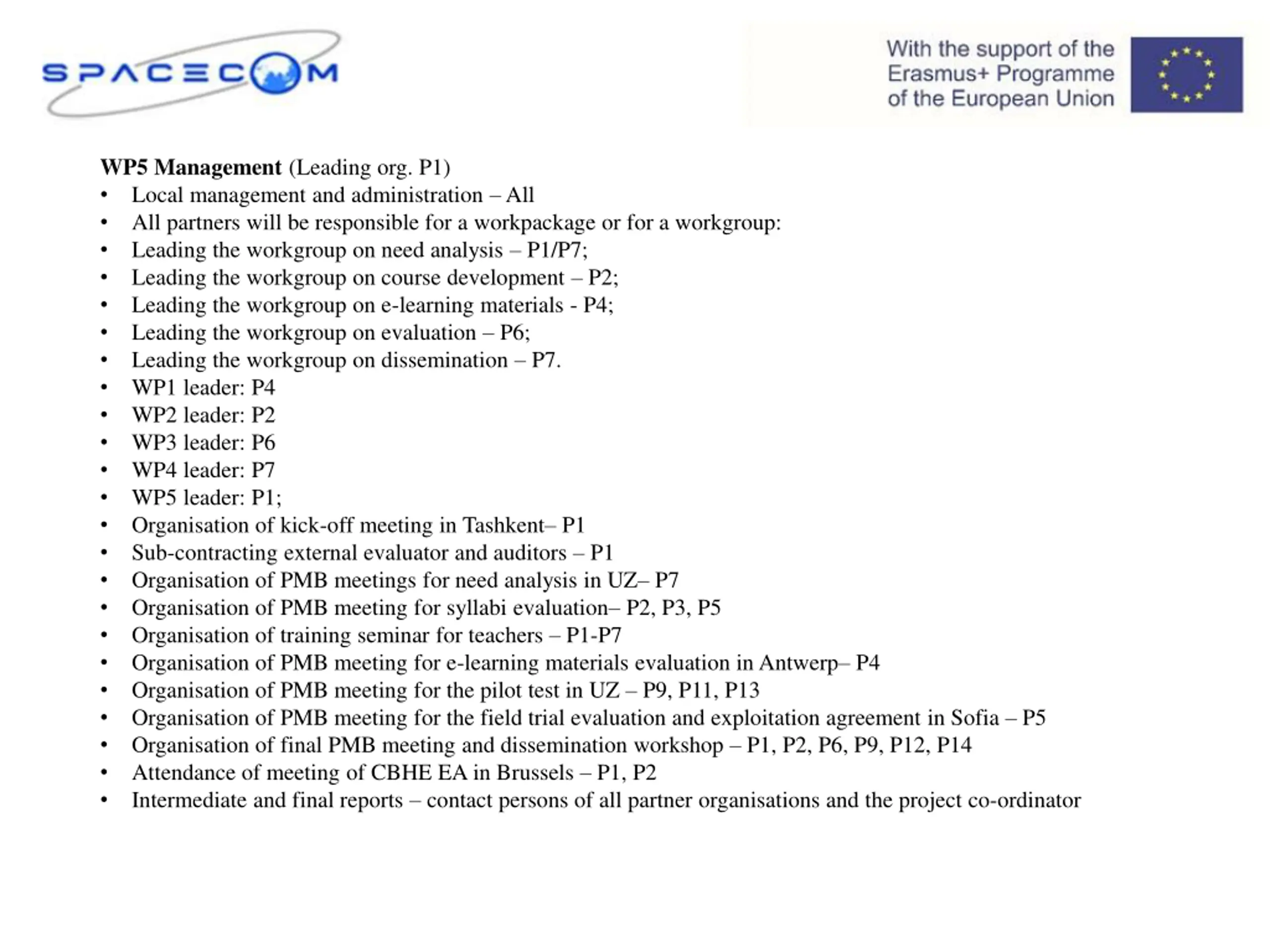 WP5 Management (Leading org. P1) Local management and administration All All partners will be responsible for a workpackage or for a workgroup: Leading the workgroup on need analysis P1/P7; Leading the workgroup on course development P2; Leading the workgroup on e-learning materials - P4; Leading the workgroup on evaluation P6; Leading the workgroup on dissemination P7. WP1 leader: P4 WP2 leader: P2 WP3 leader: P6 WP4 leader: P7 WP5 leader: P1; Organisation of kick-off meeting in Tashkent P1 Sub-contracting external evaluator and auditors P1 Organisation of PMB meetings for need analysis in UZ P7 Organisation of PMB meeting for syllabi evaluation P2, P3, P5 Organisation of training seminar for teachers P1-P7 Organisation of PMB meeting for e-learning materials evaluation in Antwerp P4 Organisation of PMB meeting for the pilot test in UZ P9, P11, P13 Organisation of PMB meeting for the field trial evaluation and exploitation agreement in Sofia P5 Organisation of final PMB meeting and dissemination workshop P1, P2, P6, P9, P12, P14 Attendance of meeting of CBHE EA in Brussels P1, P2 Intermediate and final reports contact persons of all partner organisations and the project co-ordinator