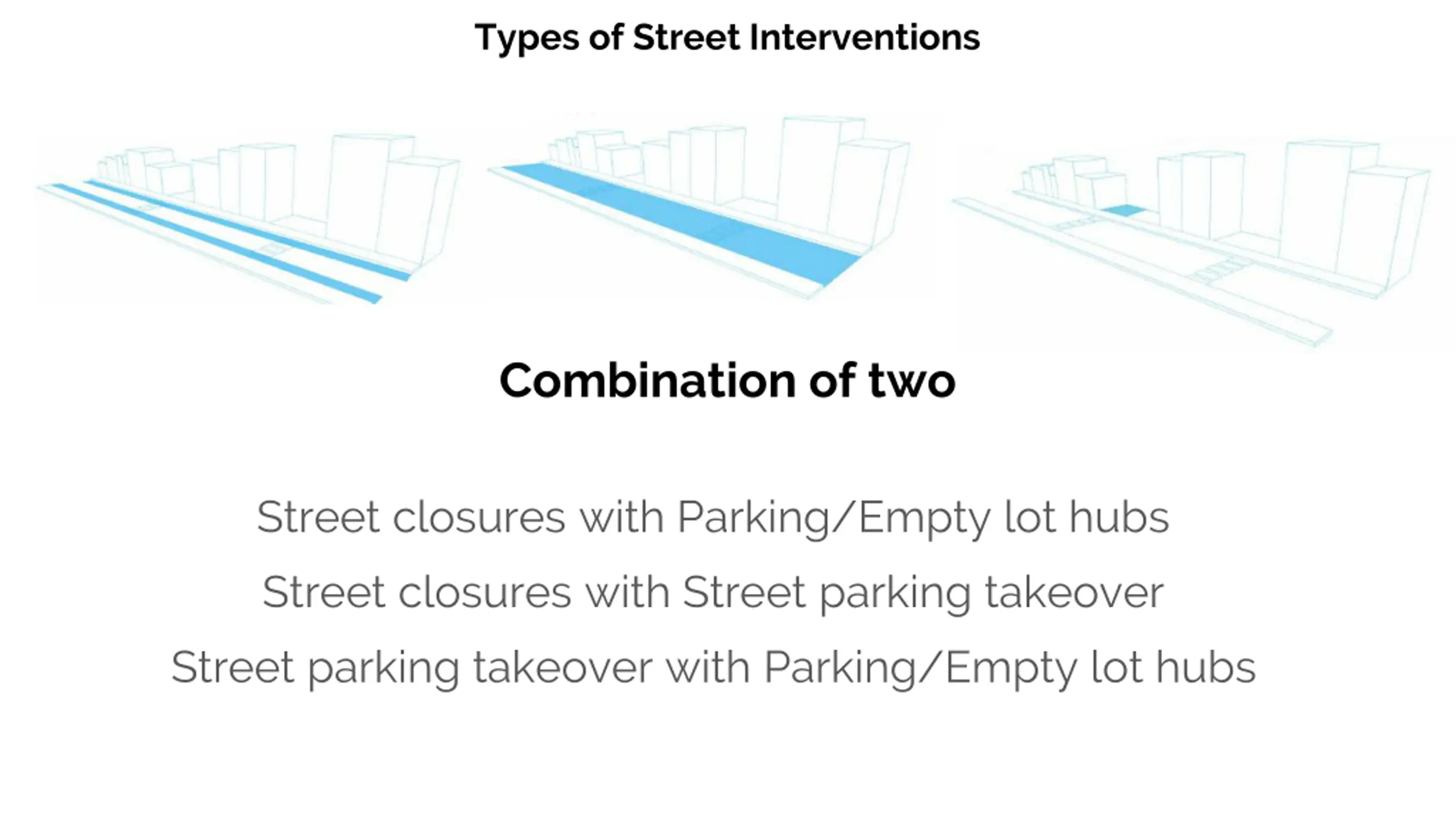 Types of Street Interventions Combination of two Street closures with Parking/Empty lot hubs Street closures with Street parking takeover Street parking takeover with Parking/Empty lot hubs