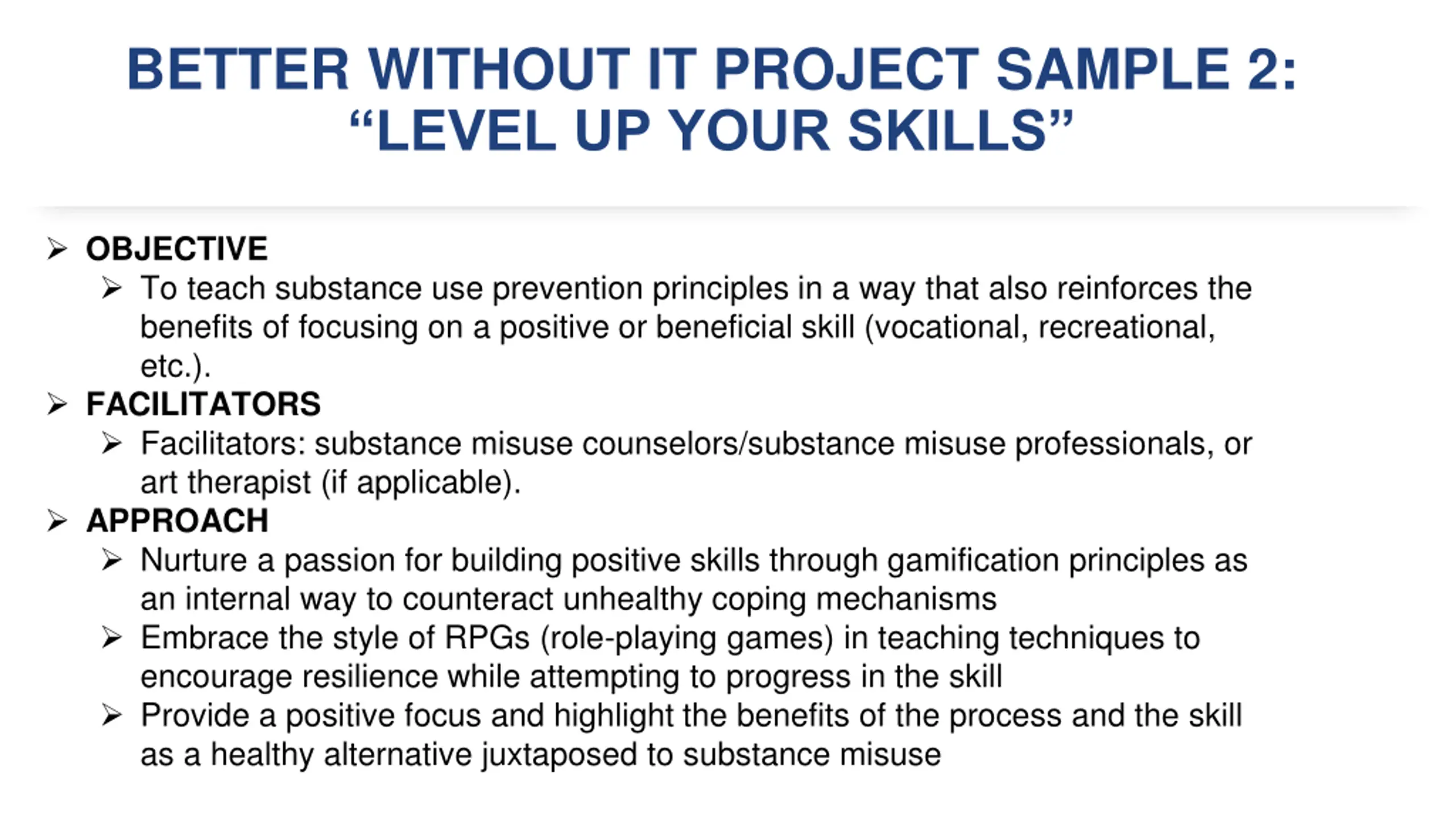 BETTER WITHOUT IT PROJECT SAMPLE 2: LEVEL UP YOUR SKILLS OBJECTIVE To teach substance use prevention principles in a way that also reinforces the benefits of focusing on a positive or beneficial skill (vocational, recreational, etc.). FACILITATORS Facilitators: substance misuse counselors/substance misuse professionals, or art therapist (if applicable). APPROACH Nurture a passion for building positive skills through gamification principles as an internal way to counteract unhealthy coping mechanisms Embrace the style of RPGs (role-playing games) in teaching techniques to encourage resilience while attempting to progress in the skill Provide a positive focus and highlight the benefits of the process and the skill as a healthy alternative juxtaposed to substance misuse