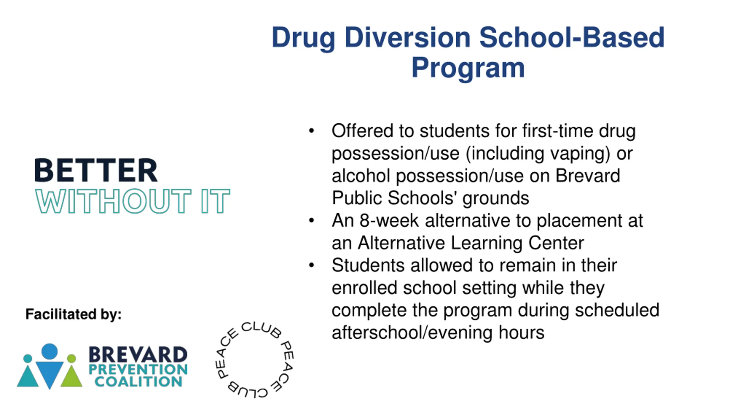 Drug Diversion School-Based Program Offered to students for first-time drug possession/use (including vaping) or alcohol possession/use on Brevard Public Schools' grounds An 8-week alternative to placement at an Alternative Learning Center Students allowed to remain in their enrolled school setting while they complete the program during scheduled afterschool/evening hours Facilitated by: