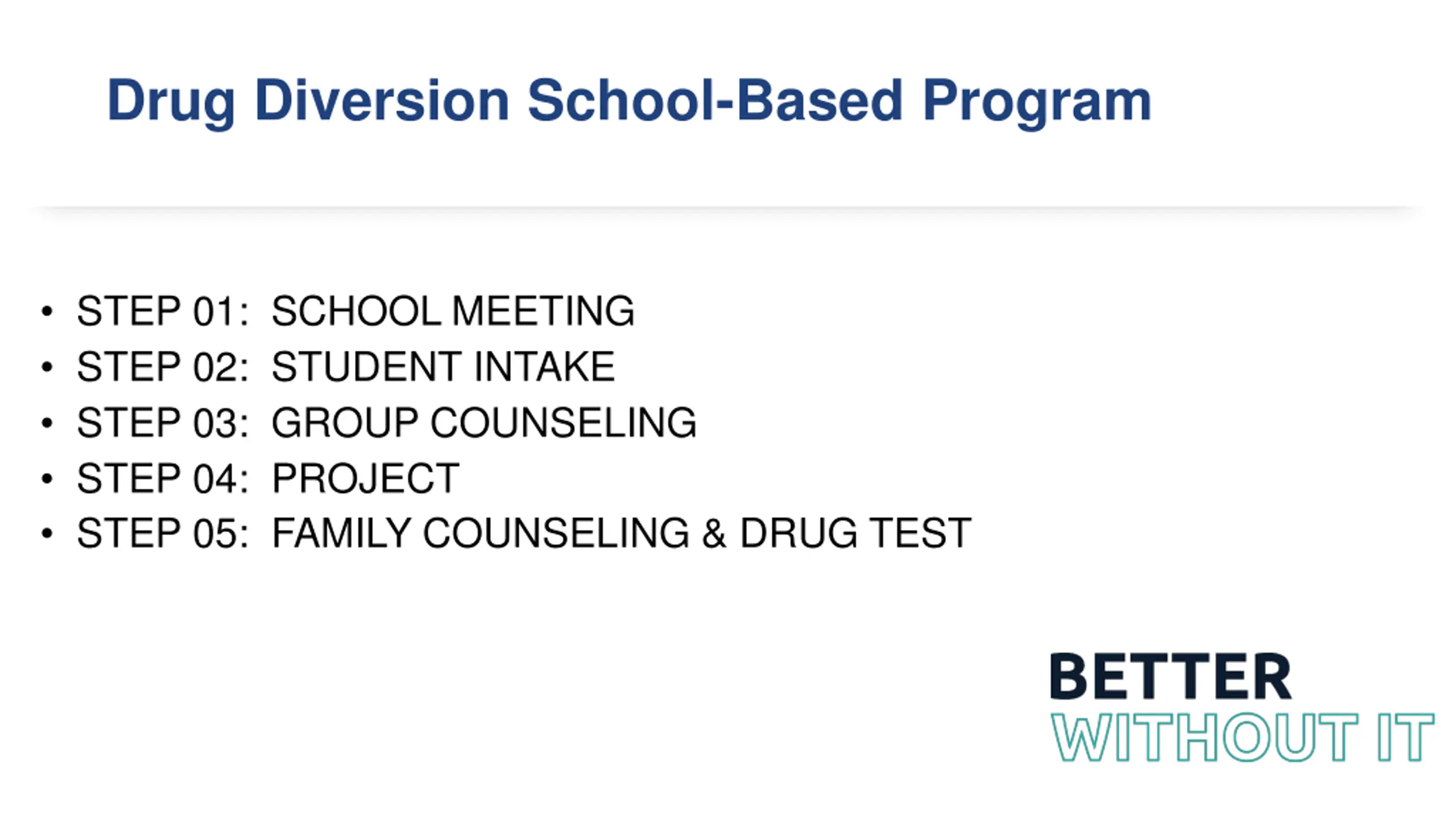Drug Diversion School-Based Program STEP 01: SCHOOL MEETING STEP 02: STUDENT INTAKE STEP 03: GROUP COUNSELING STEP 04: PROJECT STEP 05: FAMILY COUNSELING & DRUG TEST