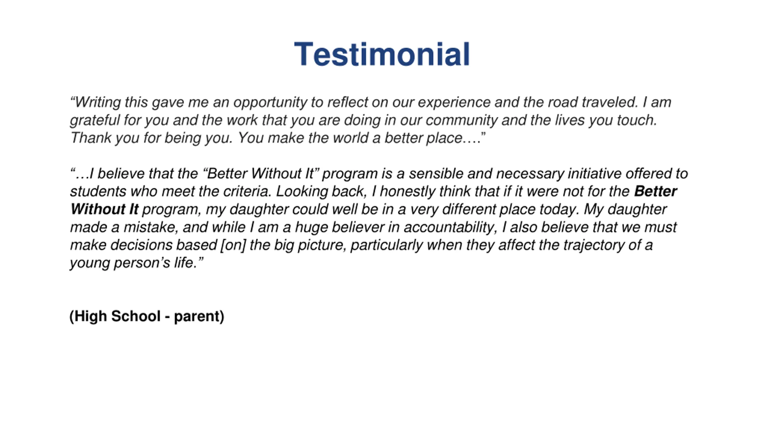 Testimonial Writing this gave me an opportunity to reflect on our experience and the road traveled. I am grateful for you and the work that you are doing in our community and the lives you touch. Thank you for being you. You make the world a better place . I believe that the Better Without It program is a sensible and necessary initiative offered to students who meet the criteria. Looking back, I honestly think that if it were not for the Better Without It program, my daughter could well be in a very different place today. My daughter made a mistake, and while I am a huge believer in accountability, I also believe that we must make decisions based [on] the big picture, particularly when they affect the trajectory of a young person s life. (High School - parent)