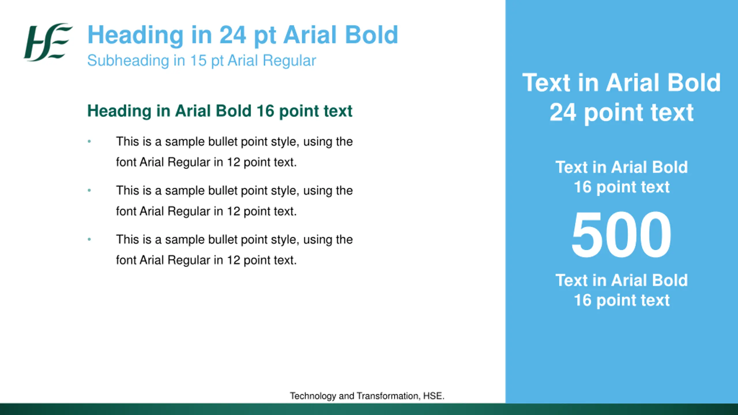 Heading in 24 pt Arial Bold Subheading in 15 pt Arial Regular Text in Arial Bold 24 point text Heading in Arial Bold 16 point text This is a sample bullet point style, using the font Arial Regular in 12 point text. Text in Arial Bold 16 point text 500 Text in Arial Bold 16 point text This is a sample bullet point style, using the font Arial Regular in 12 point text. This is a sample bullet point style, using the font Arial Regular in 12 point text. Technology and Transformation, HSE.