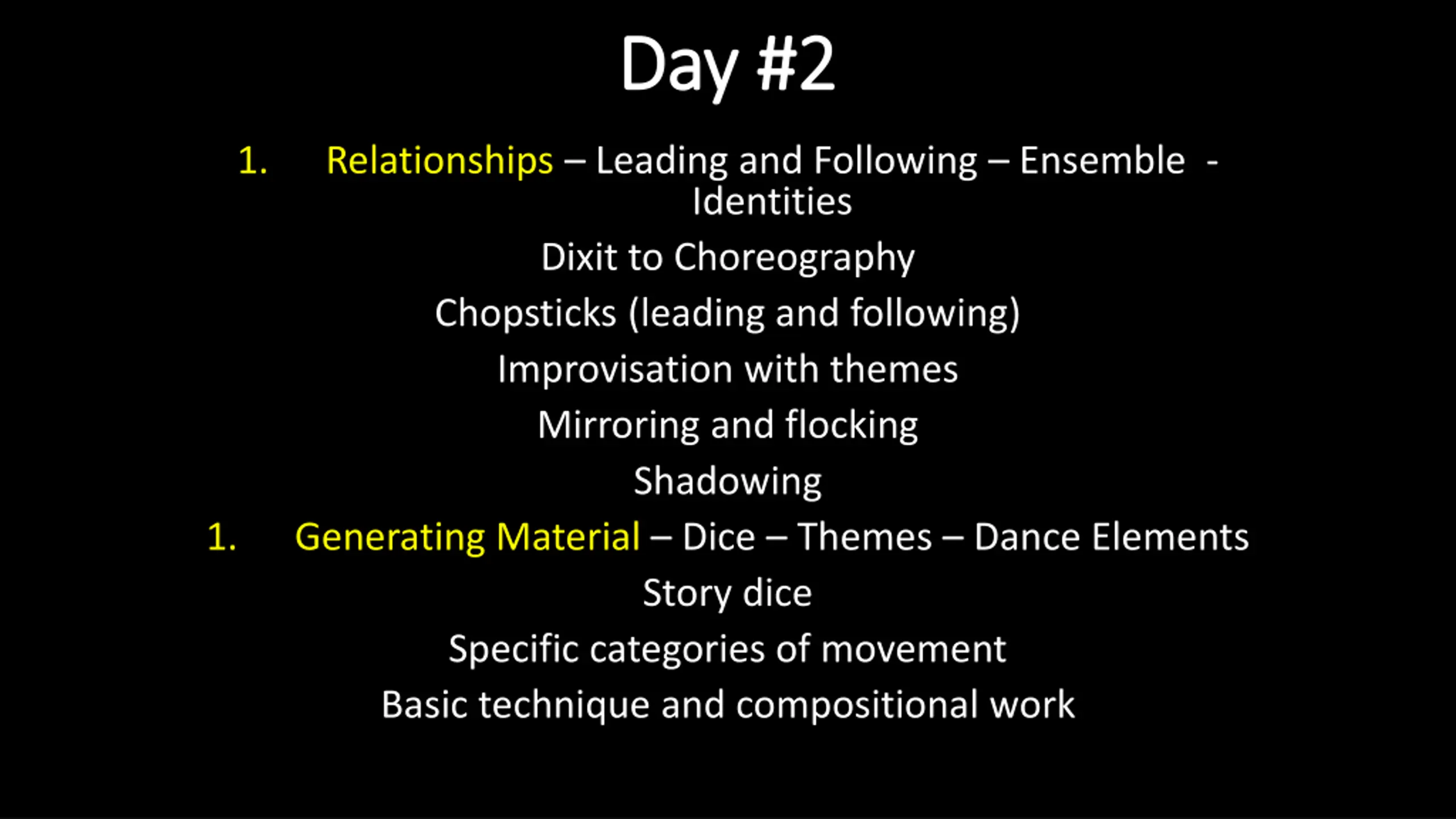 Day #2 Day #2 1. Relationships Leading and Following Ensemble - Identities Dixit to Choreography Chopsticks (leading and following) Improvisation with themes Mirroring and flocking Shadowing Generating Material Dice Themes Dance Elements Story dice Specific categories of movement Basic technique and compositional work 1.