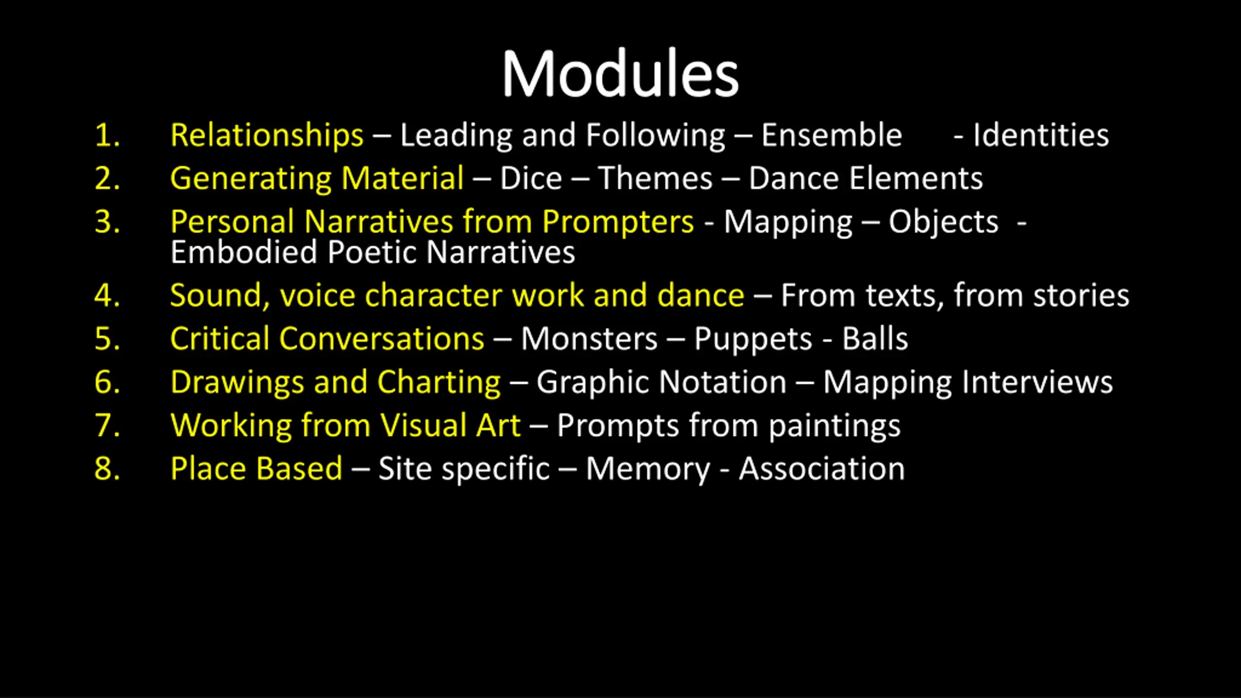 Modules Modules 1. 2. 3. Relationships Leading and Following Ensemble - Identities Generating Material Dice Themes Dance Elements Personal Narratives from Prompters - Mapping Objects - Embodied Poetic Narratives Sound, voice character work and dance From texts, from stories Critical Conversations Monsters Puppets - Balls Drawings and Charting Graphic Notation Mapping Interviews Working from Visual Art Prompts from paintings Place Based Site specific Memory - Association 4. 5. 6. 7. 8.