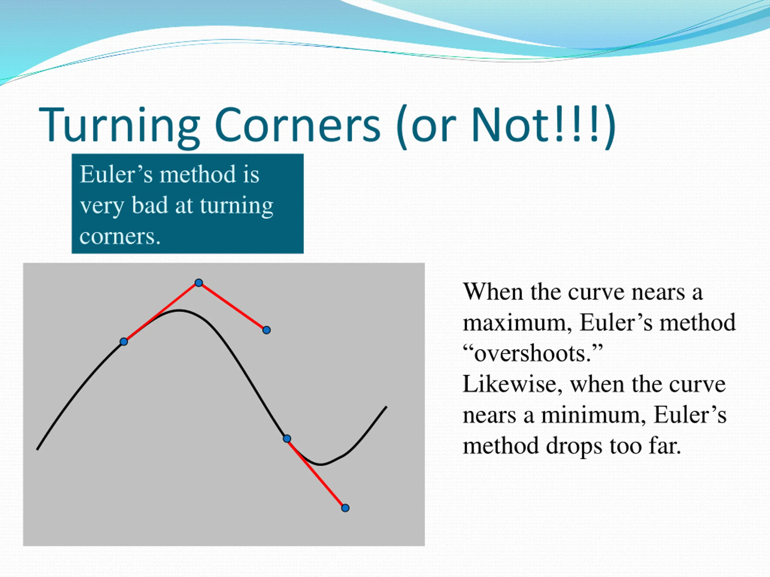 Turning Corners (or Not!!!) Euler s method is very bad at turning corners. When the curve nears a maximum, Euler s method overshoots. Likewise, when the curve nears a minimum, Euler s method drops too far.