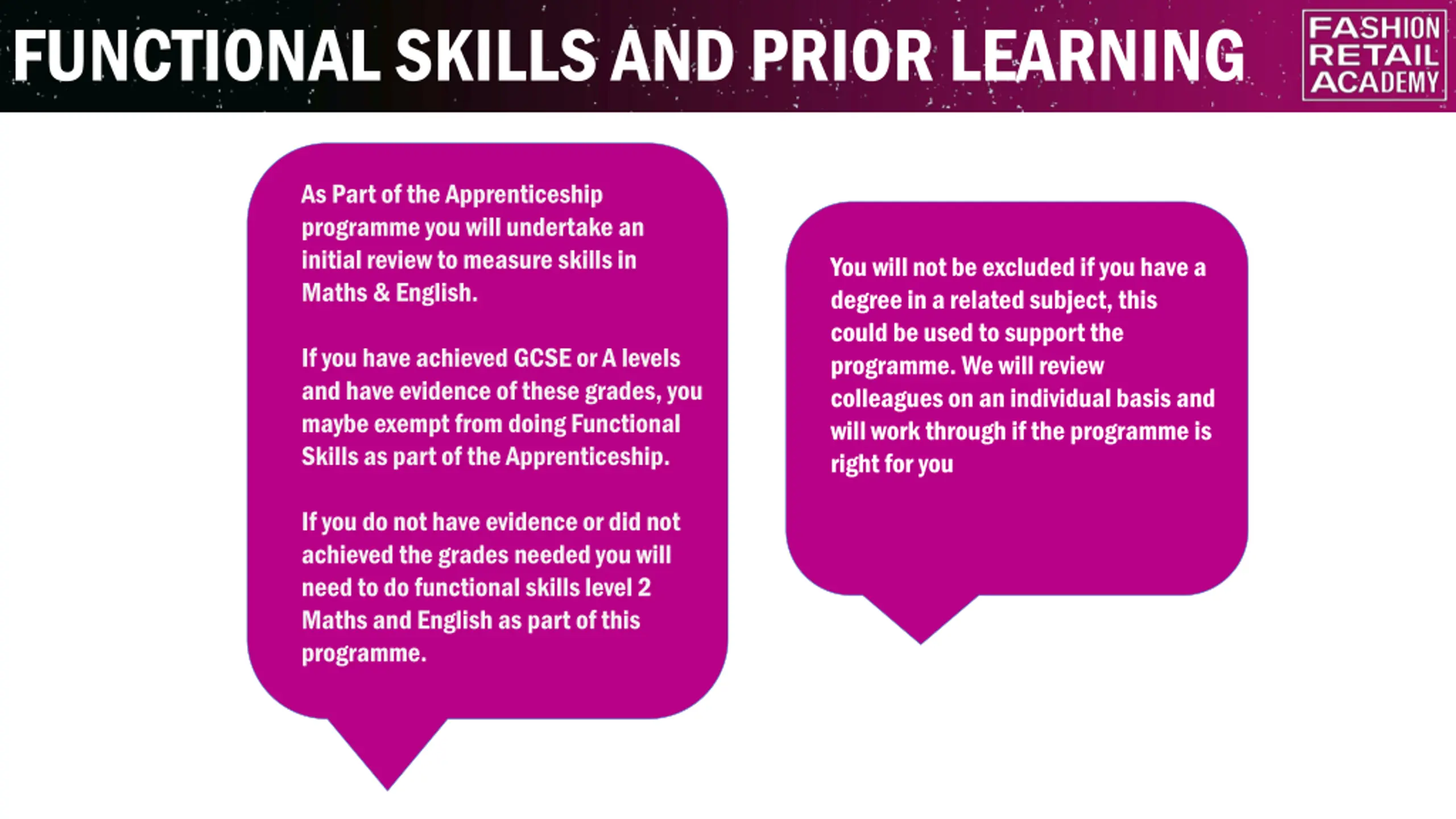 FUNCTIONAL SKILLS AND PRIOR LEARNING As Part of the Apprenticeship programme you will undertake an initial review to measure skills in Maths & English. You will not be excluded if you have a degree in a related subject, this could be used to support the programme. We will review colleagues on an individual basis and will work through if the programme is right for you If you have achieved GCSE or A levels and have evidence of these grades, you maybe exempt from doing Functional Skills as part of the Apprenticeship. If you do not have evidence or did not achieved the grades needed you will need to do functional skills level 2 Maths and English as part of this programme.