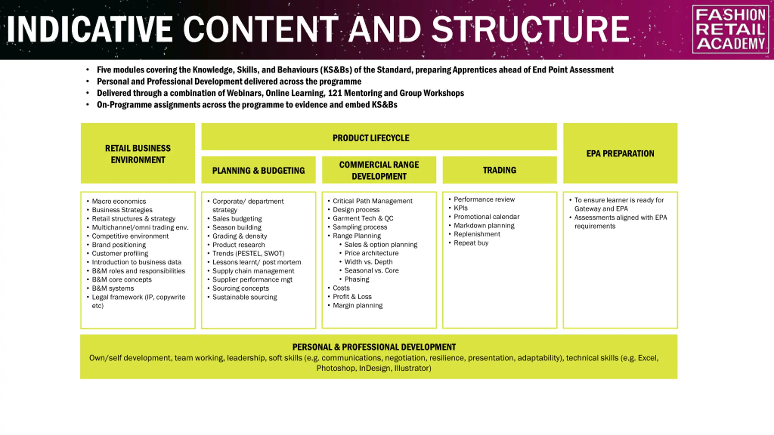 INDICATIVE CONTENT AND STRUCTURE Five modules covering the Knowledge, Skills, and Behaviours (KS&Bs) of the Standard, preparing Apprentices ahead of End Point Assessment Personal and Professional Development delivered across the programme Delivered through a combination of Webinars, Online Learning, 121 Mentoring and Group Workshops On-Programme assignments across the programme to evidence and embed KS&Bs PRODUCT LIFECYCLE RETAIL BUSINESS ENVIRONMENT EPA PREPARATION COMMERCIAL RANGE DEVELOPMENT TRADING PLANNING & BUDGETING Performance review KPIs Promotional calendar Markdown planning Replenishment Repeat buy To ensure learner is ready for Gateway and EPA Assessments aligned with EPA requirements Critical Path Management Design process Garment Tech & QC Sampling process Range Planning Sales & option planning Price architecture Width vs. Depth Seasonal vs. Core Phasing Costs Profit & Loss Margin planning Macro economics Business Strategies Retail structures & strategy Multichannel/omni trading env. Competitive environment Brand positioning Customer profiling Introduction to business data B&M roles and responsibilities B&M core concepts B&M systems Legal framework (IP, copywrite etc) Corporate/ department strategy Sales budgeting Season building Grading & density Product research Trends (PESTEL, SWOT) Lessons learnt/ post mortem Supply chain management Supplier performance mgt Sourcing concepts Sustainable sourcing PERSONAL & PROFESSIONAL DEVELOPMENT Own/self development, team working, leadership, soft skills (e.g. communications, negotiation, resilience, presentation, adaptability), technical skills (e.g. Excel, Photoshop, InDesign, Illustrator)