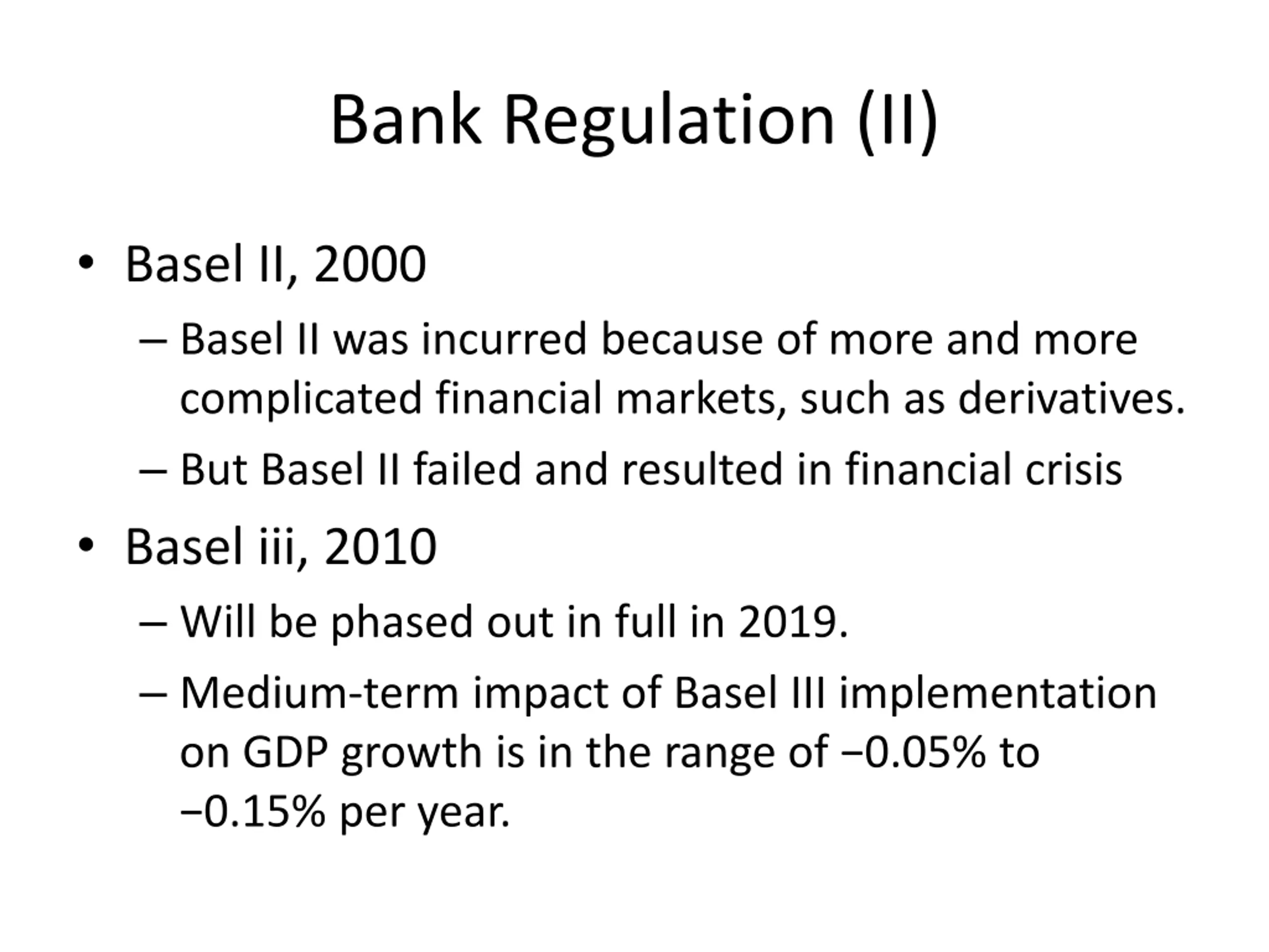 Bank Regulation (II) Basel II, 2000 Basel II was incurred because of more and more complicated financial markets, such as derivatives. But Basel II failed and resulted in financial crisis Basel iii, 2010 Will be phased out in full in 2019. Medium-term impact of Basel III implementation on GDP growth is in the range of 0.05% to 0.15% per year.