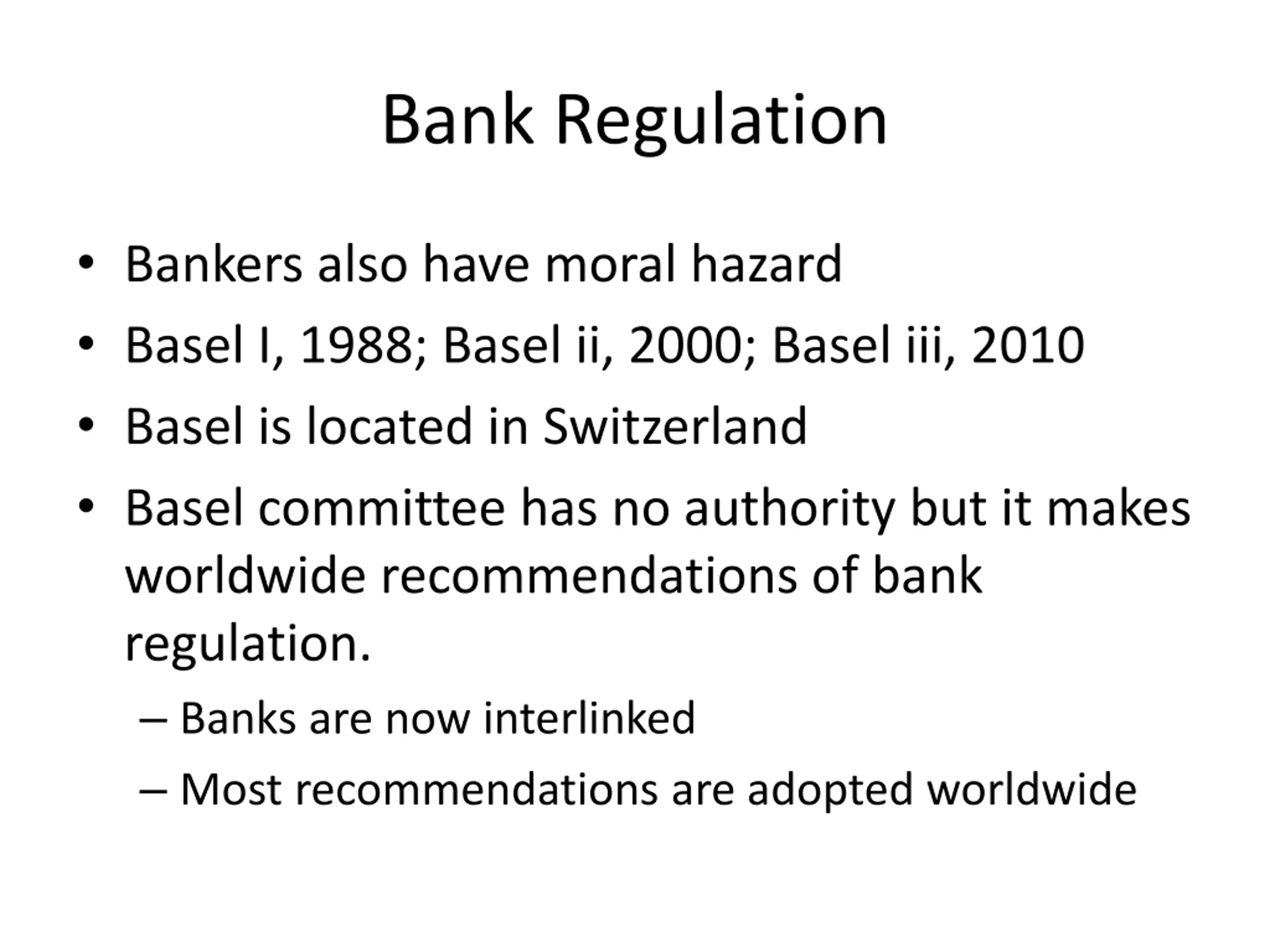 Bank Regulation Bankers also have moral hazard Basel I, 1988; Basel ii, 2000; Basel iii, 2010 Basel is located in Switzerland Basel committee has no authority but it makes worldwide recommendations of bank regulation. Banks are now interlinked Most recommendations are adopted worldwide