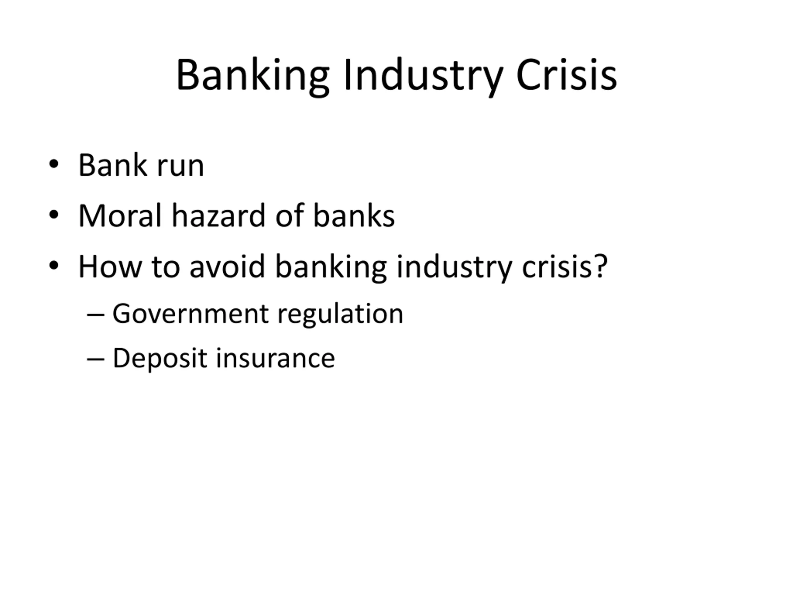 Banking Industry Crisis Bank run Moral hazard of banks How to avoid banking industry crisis? Government regulation Deposit insurance