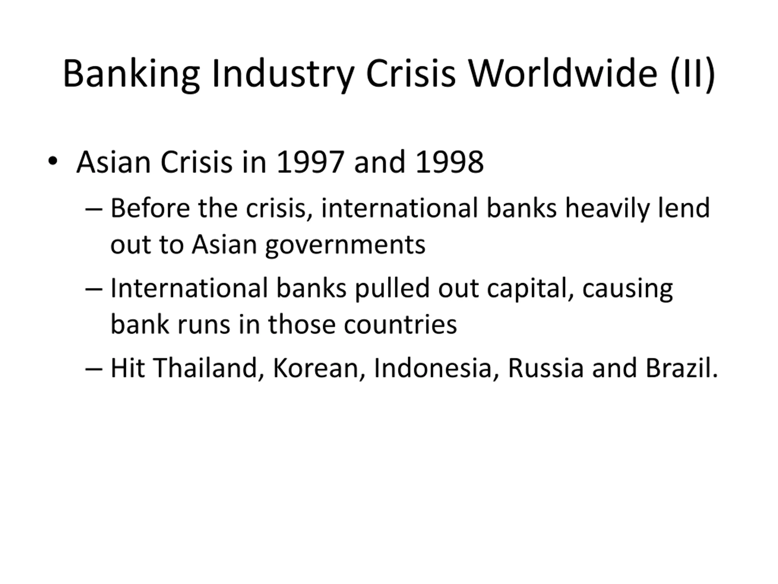 Banking Industry Crisis Worldwide (II) Asian Crisis in 1997 and 1998 Before the crisis, international banks heavily lend out to Asian governments International banks pulled out capital, causing bank runs in those countries Hit Thailand, Korean, Indonesia, Russia and Brazil.