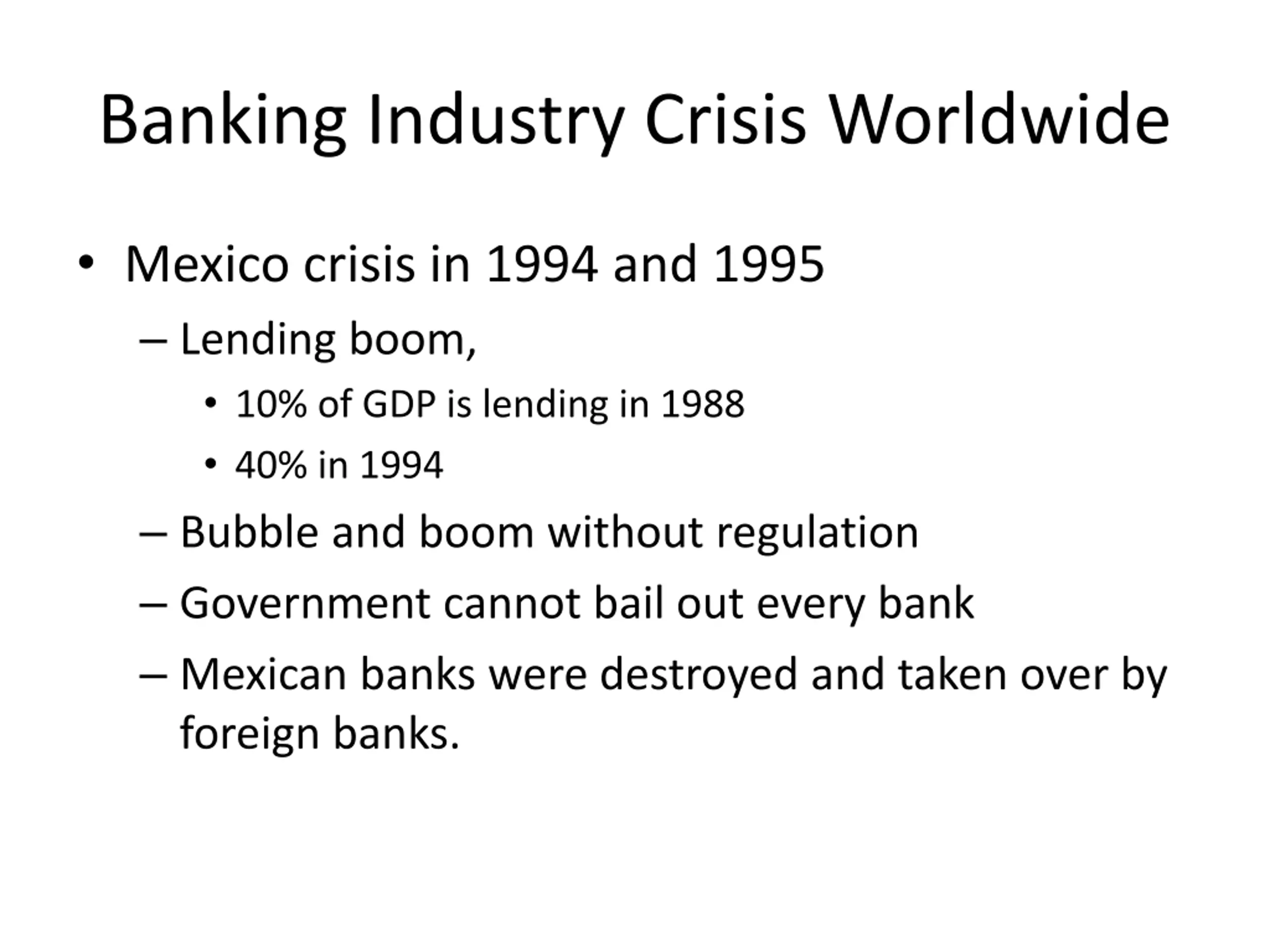 Banking Industry Crisis Worldwide Mexico crisis in 1994 and 1995 Lending boom, 10% of GDP is lending in 1988 40% in 1994 Bubble and boom without regulation Government cannot bail out every bank Mexican banks were destroyed and taken over by foreign banks.