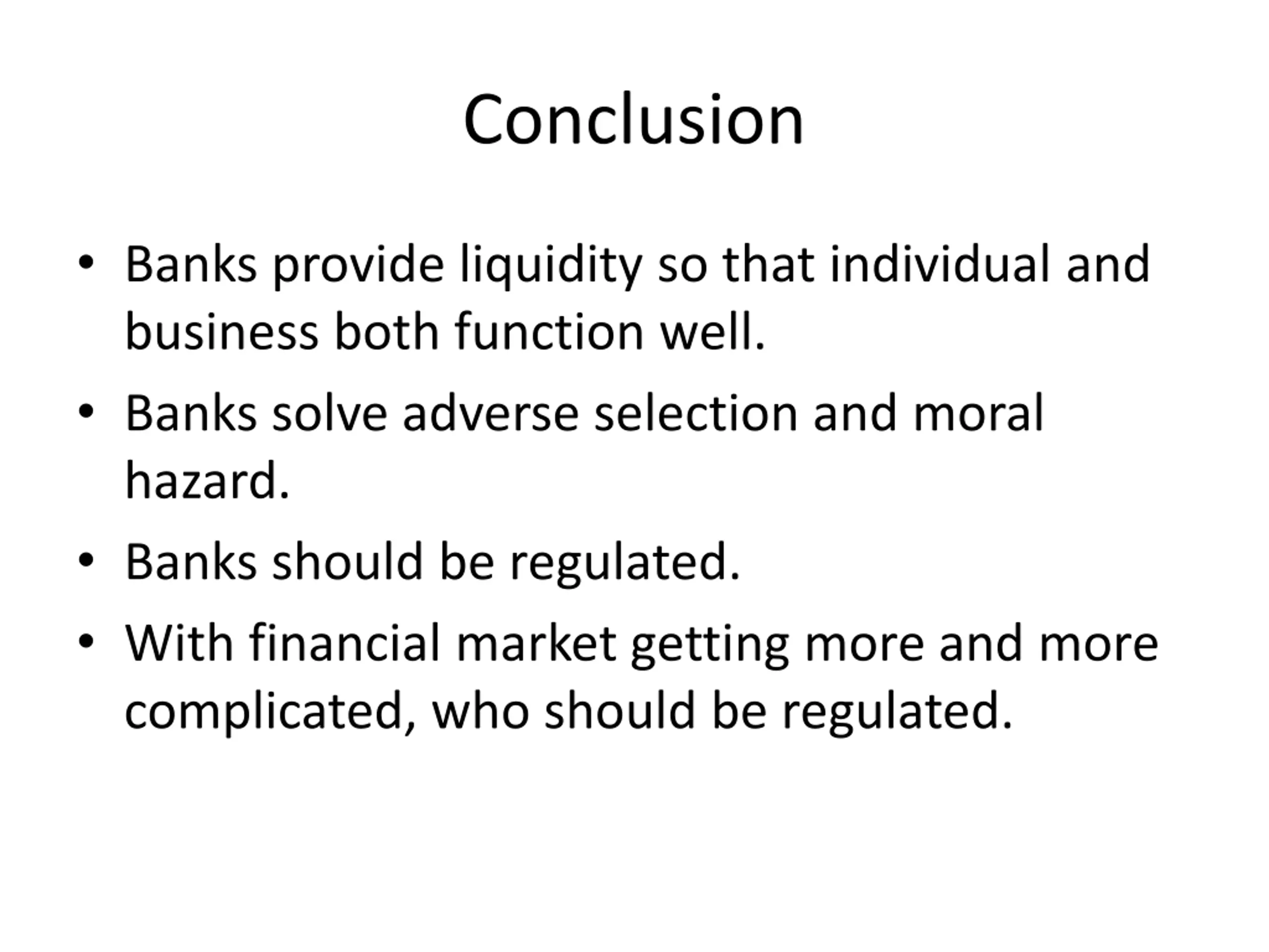 Conclusion Banks provide liquidity so that individual and business both function well. Banks solve adverse selection and moral hazard. Banks should be regulated. With financial market getting more and more complicated, who should be regulated.
