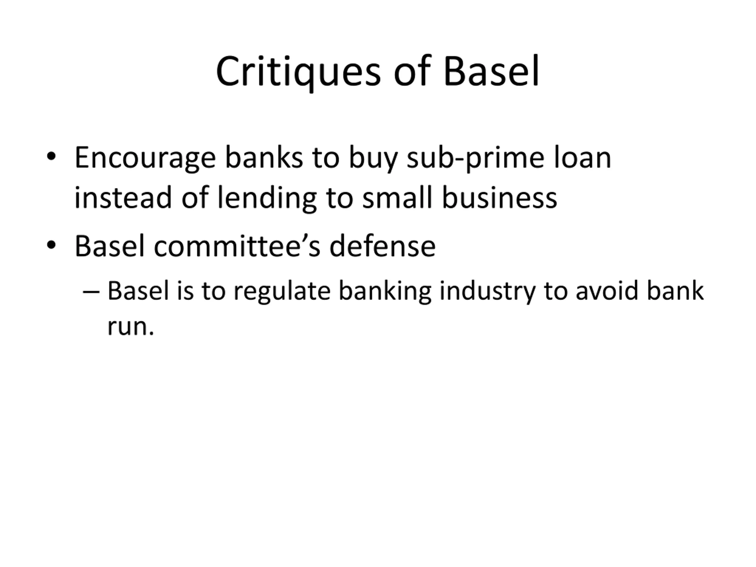 Critiques of Basel Encourage banks to buy sub-prime loan instead of lending to small business Basel committee s defense Basel is to regulate banking industry to avoid bank run.