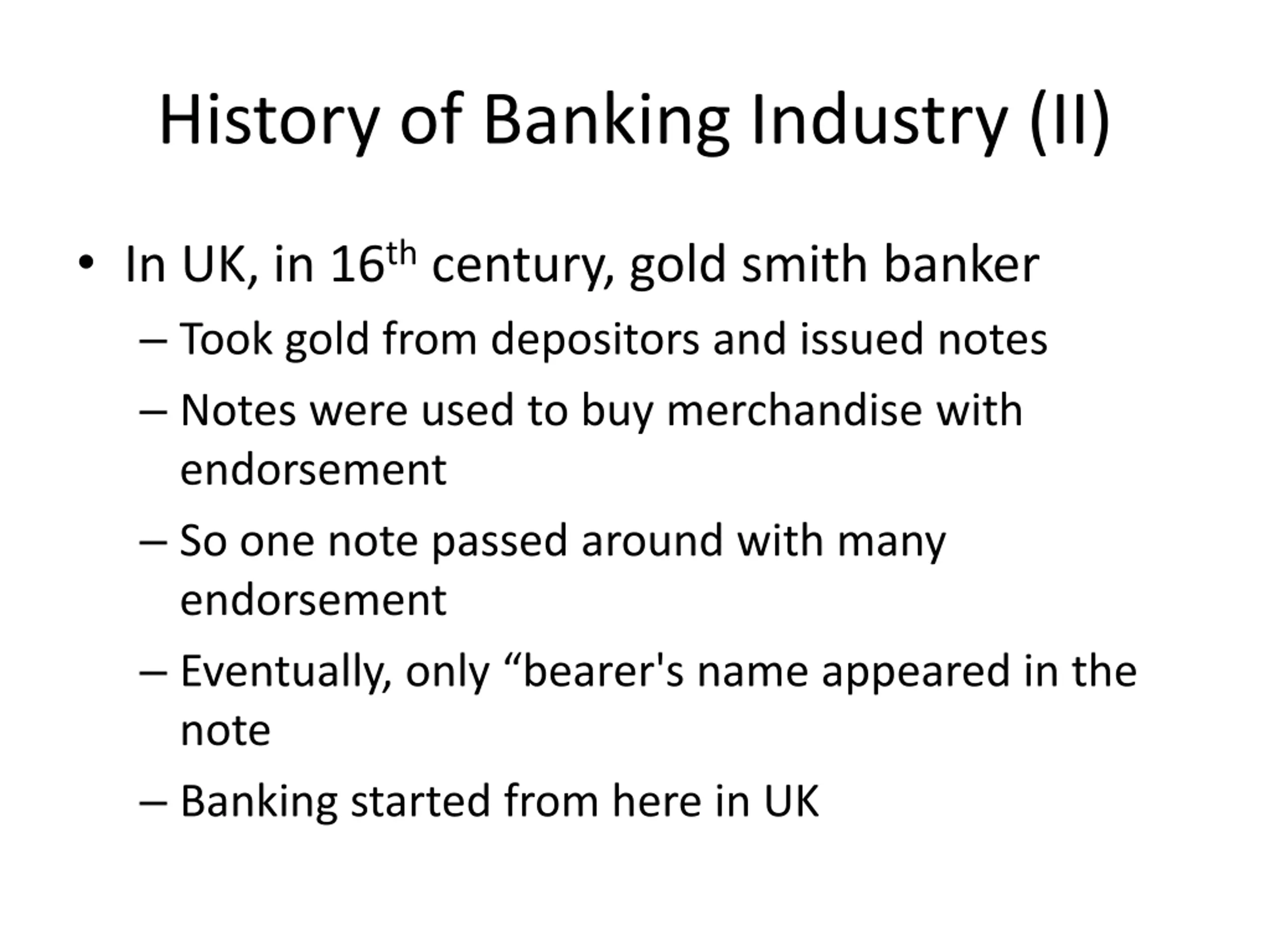 History of Banking Industry (II) In UK, in 16th century, gold smith banker Took gold from depositors and issued notes Notes were used to buy merchandise with endorsement So one note passed around with many endorsement Eventually, only bearer's name appeared in the note Banking started from here in UK