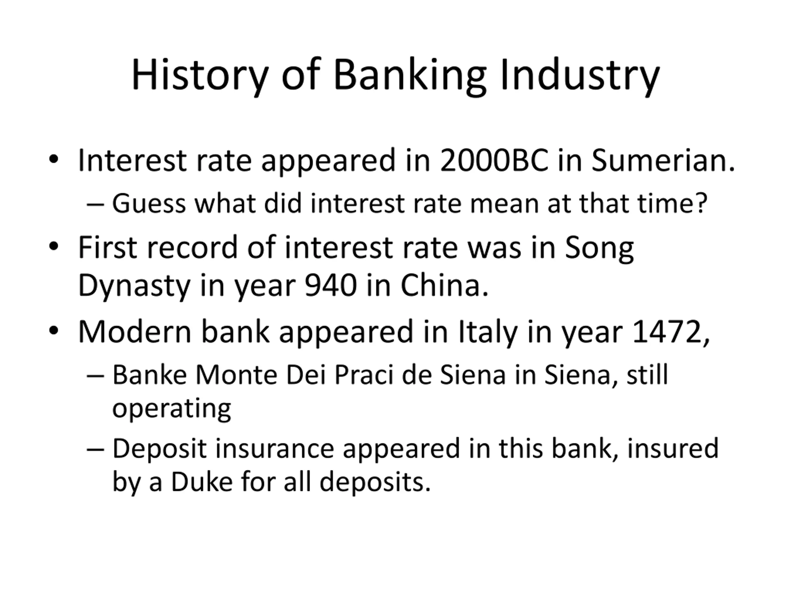 History of Banking Industry Interest rate appeared in 2000BC in Sumerian. Guess what did interest rate mean at that time? First record of interest rate was in Song Dynasty in year 940 in China. Modern bank appeared in Italy in year 1472, Banke Monte Dei Praci de Siena in Siena, still operating Deposit insurance appeared in this bank, insured by a Duke for all deposits.