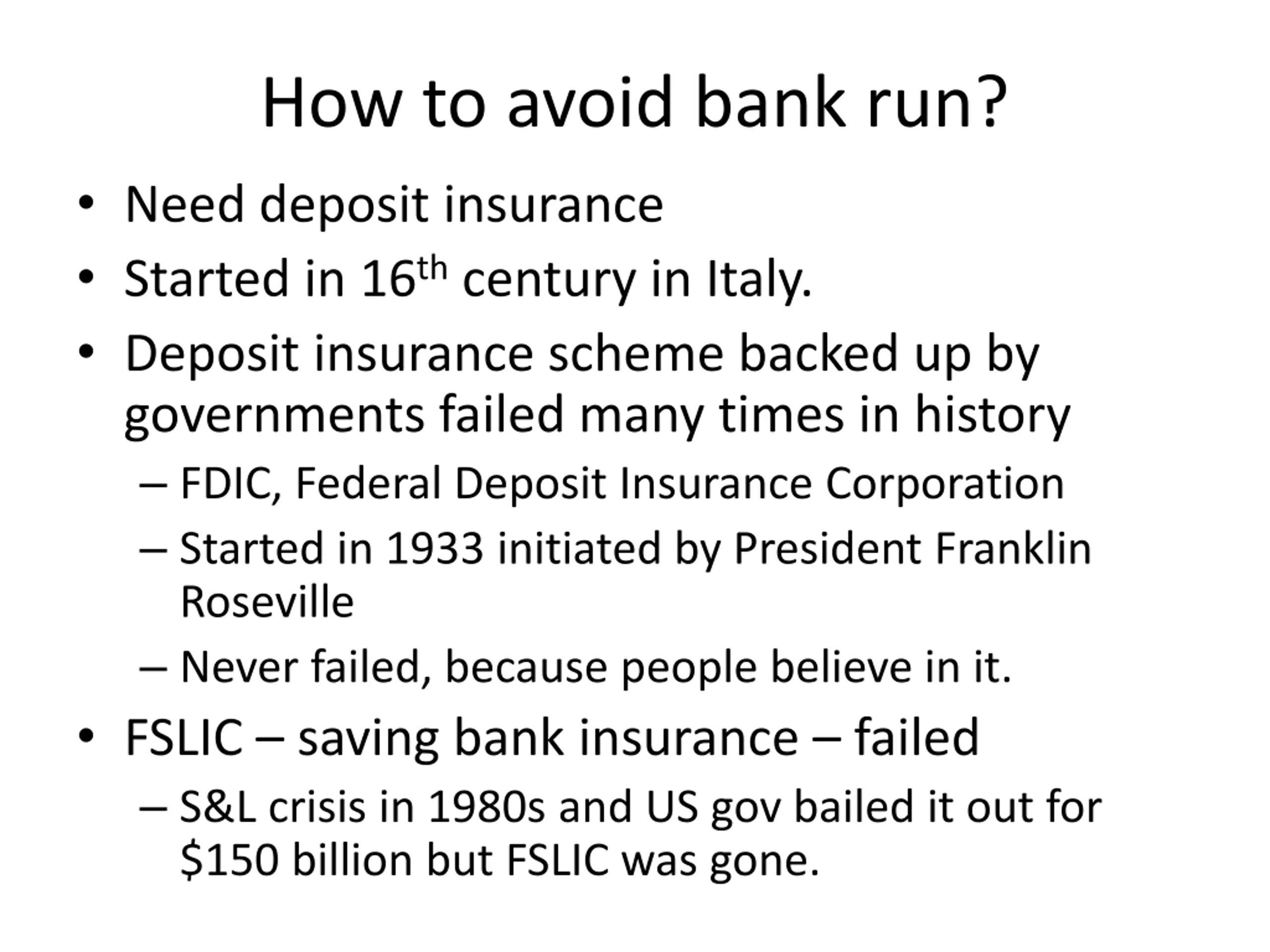 How to avoid bank run? Need deposit insurance Started in 16th century in Italy. Deposit insurance scheme backed up by governments failed many times in history FDIC, Federal Deposit Insurance Corporation Started in 1933 initiated by President Franklin Roseville Never failed, because people believe in it. FSLIC saving bank insurance failed S&L crisis in 1980s and US gov bailed it out for $150 billion but FSLIC was gone.