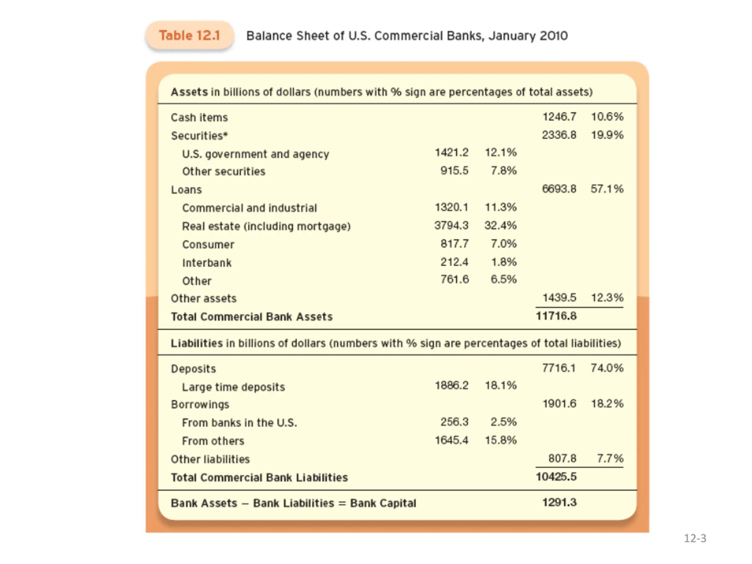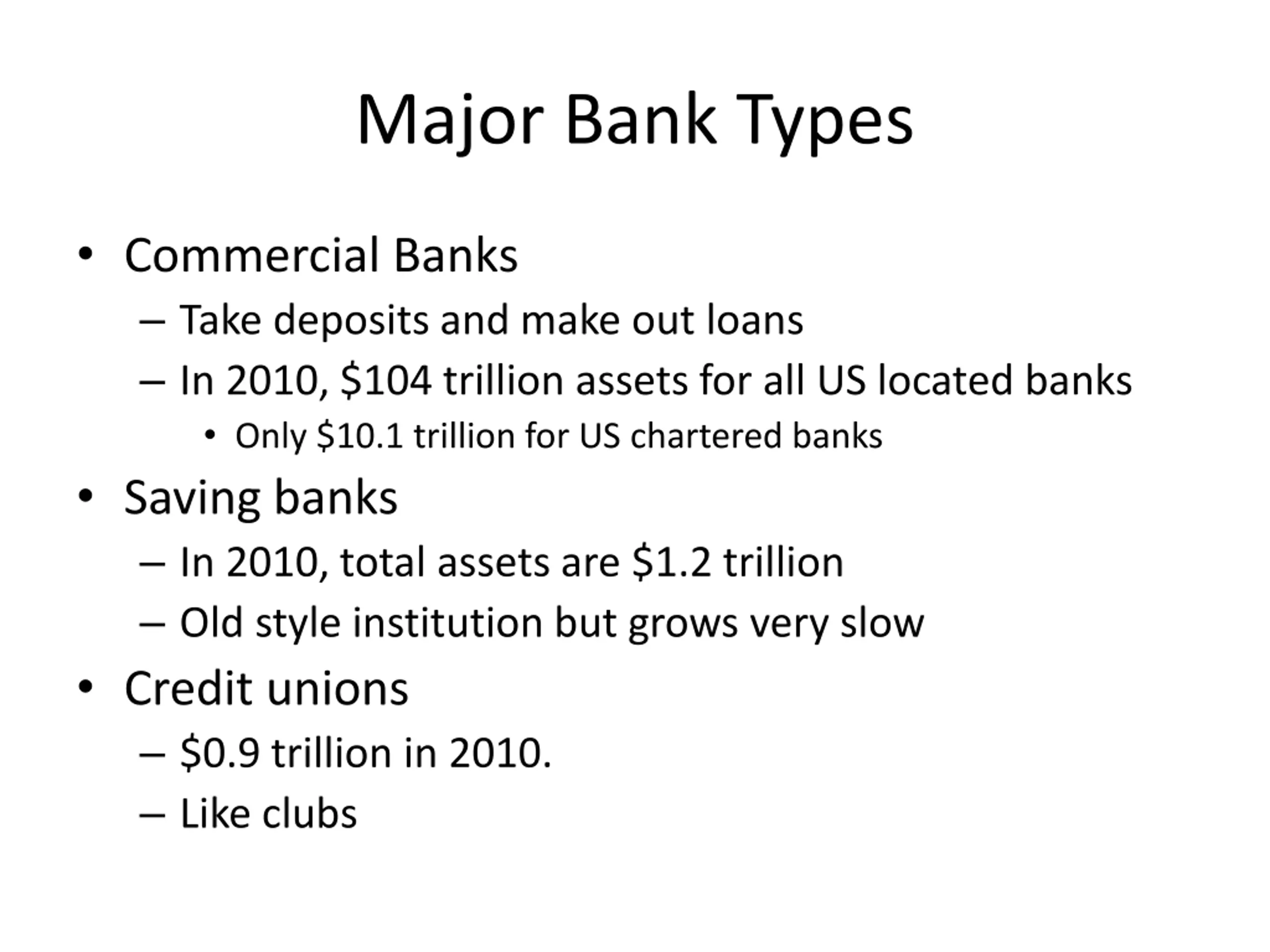 Major Bank Types Commercial Banks Take deposits and make out loans In 2010, $104 trillion assets for all US located banks Only $10.1 trillion for US chartered banks Saving banks In 2010, total assets are $1.2 trillion Old style institution but grows very slow Credit unions $0.9 trillion in 2010. Like clubs