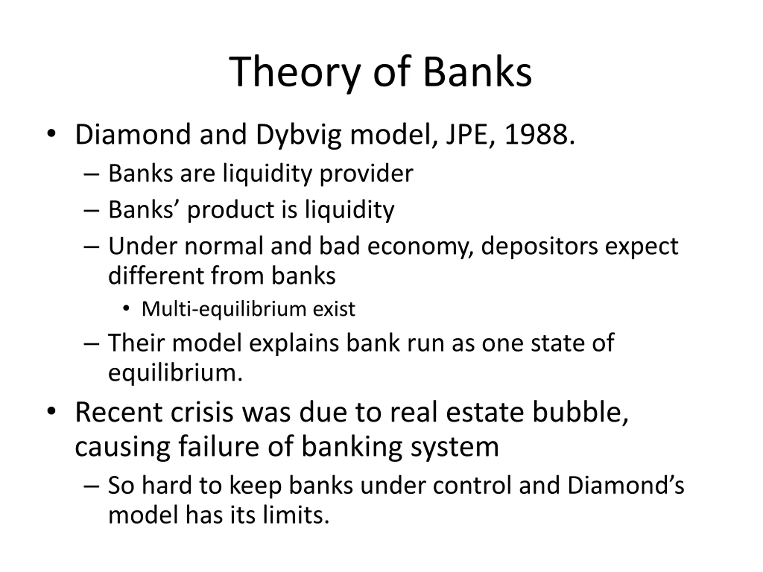 Theory of Banks Diamond and Dybvig model, JPE, 1988. Banks are liquidity provider Banks product is liquidity Under normal and bad economy, depositors expect different from banks Multi-equilibrium exist Their model explains bank run as one state of equilibrium. Recent crisis was due to real estate bubble, causing failure of banking system So hard to keep banks under control and Diamond s model has its limits.
