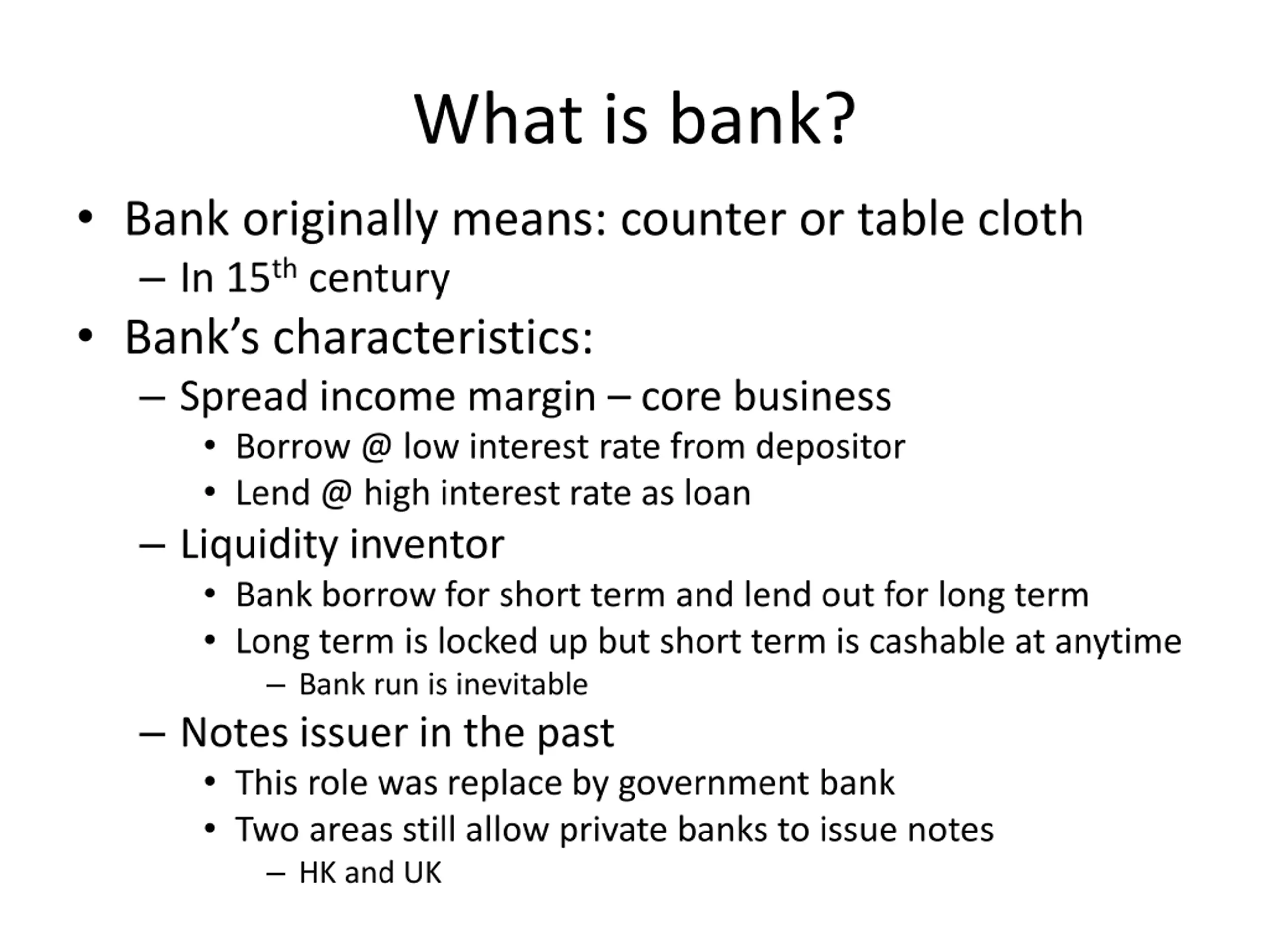 What is bank? Bank originally means: counter or table cloth In 15thcentury Bank s characteristics: Spread income margin core business Borrow @ low interest rate from depositor Lend @ high interest rate as loan Liquidity inventor Bank borrow for short term and lend out for long term Long term is locked up but short term is cashable at anytime Bank run is inevitable Notes issuer in the past This role was replace by government bank Two areas still allow private banks to issue notes HK and UK