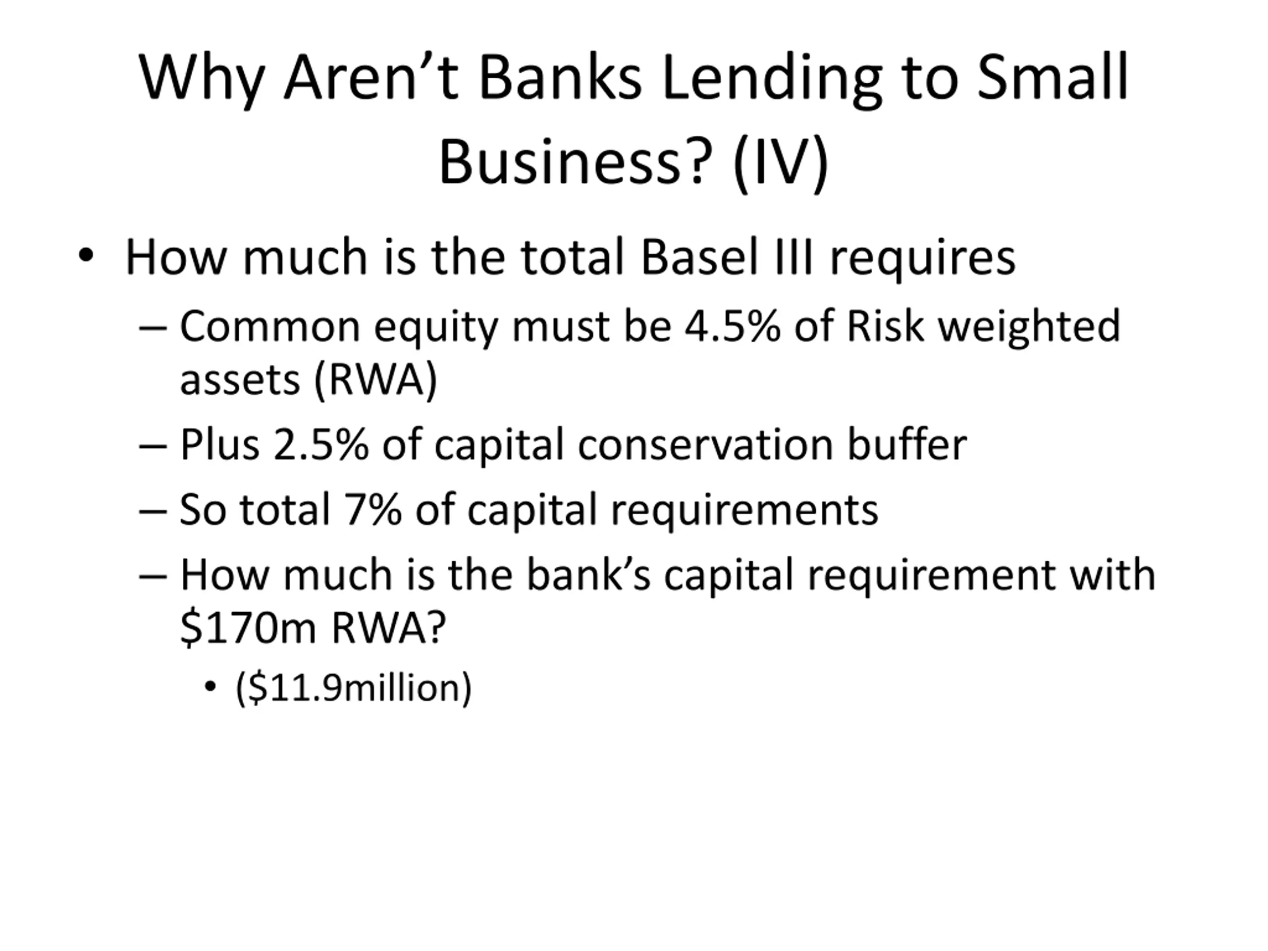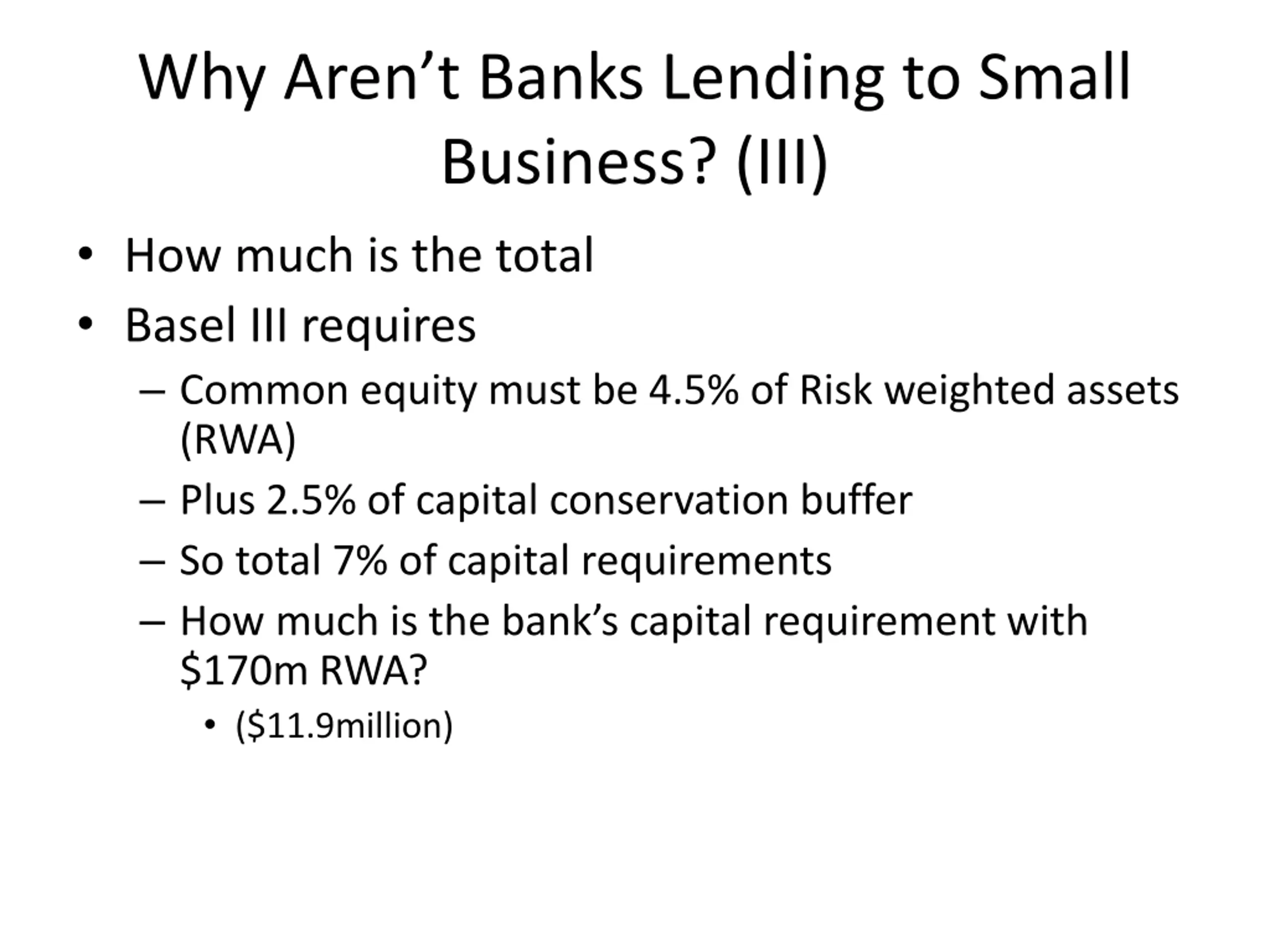 Why Arent Banks Lending to Small Business? (III) How much is the total Basel III requires Common equity must be 4.5% of Risk weighted assets (RWA) Plus 2.5% of capital conservation buffer So total 7% of capital requirements How much is the bank s capital requirement with $170m RWA? ($11.9million)