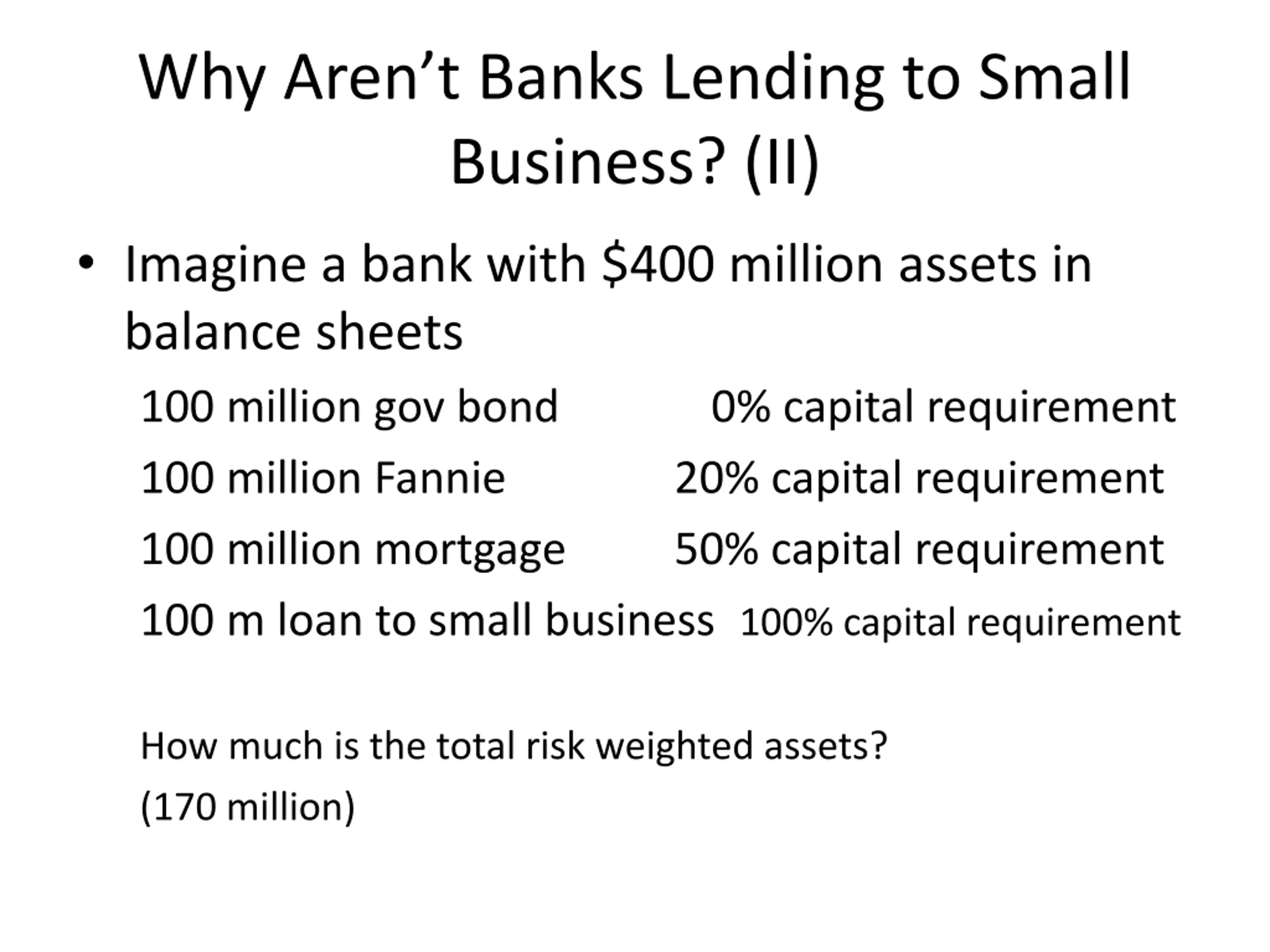 Why Arent Banks Lending to Small Business? (II) Imagine a bank with $400 million assets in balance sheets 100 million gov bond 100 million Fannie 20% capital requirement 100 million mortgage 50% capital requirement 100 m loan to small business 100% capital requirement 0% capital requirement How much is the total risk weighted assets? (170 million)