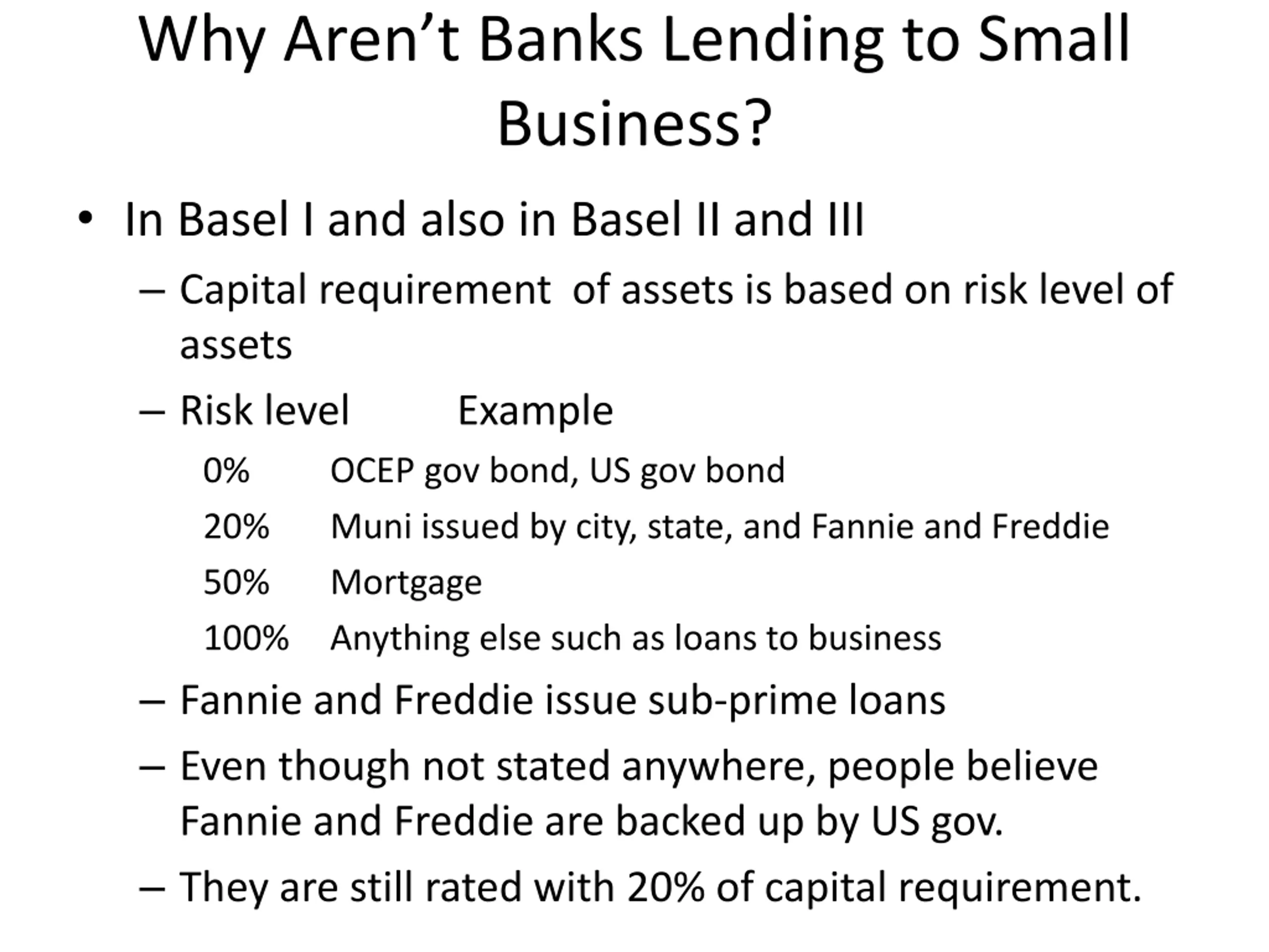 Why Arent Banks Lending to Small Business? In Basel I and also in Basel II and III Capital requirement of assets is based on risk level of assets Risk level Example 0% OCEP gov bond, US gov bond 20% Muni issued by city, state, and Fannie and Freddie 50% Mortgage 100% Anything else such as loans to business Fannie and Freddie issue sub-prime loans Even though not stated anywhere, people believe Fannie and Freddie are backed up by US gov. They are still rated with 20% of capital requirement.