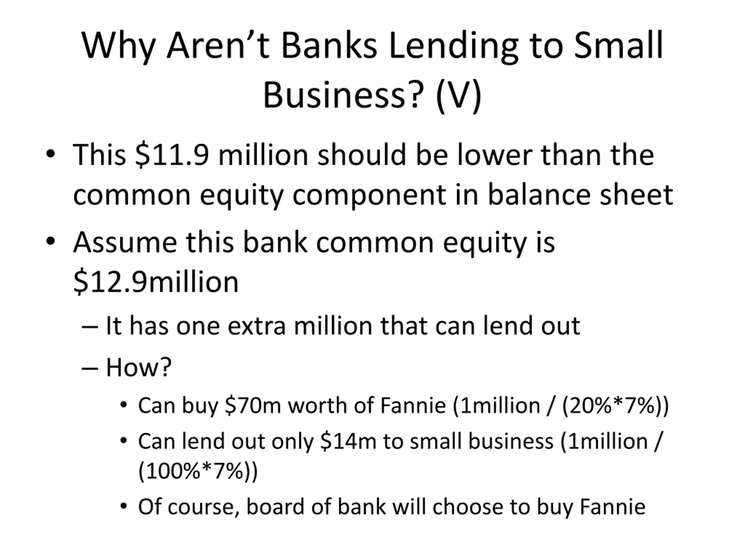 Why Arent Banks Lending to Small Business? (V) This $11.9 million should be lower than the common equity component in balance sheet Assume this bank common equity is $12.9million It has one extra million that can lend out How? Can buy $70m worth of Fannie (1million / (20%*7%)) Can lend out only $14m to small business (1million / (100%*7%)) Of course, board of bank will choose to buy Fannie