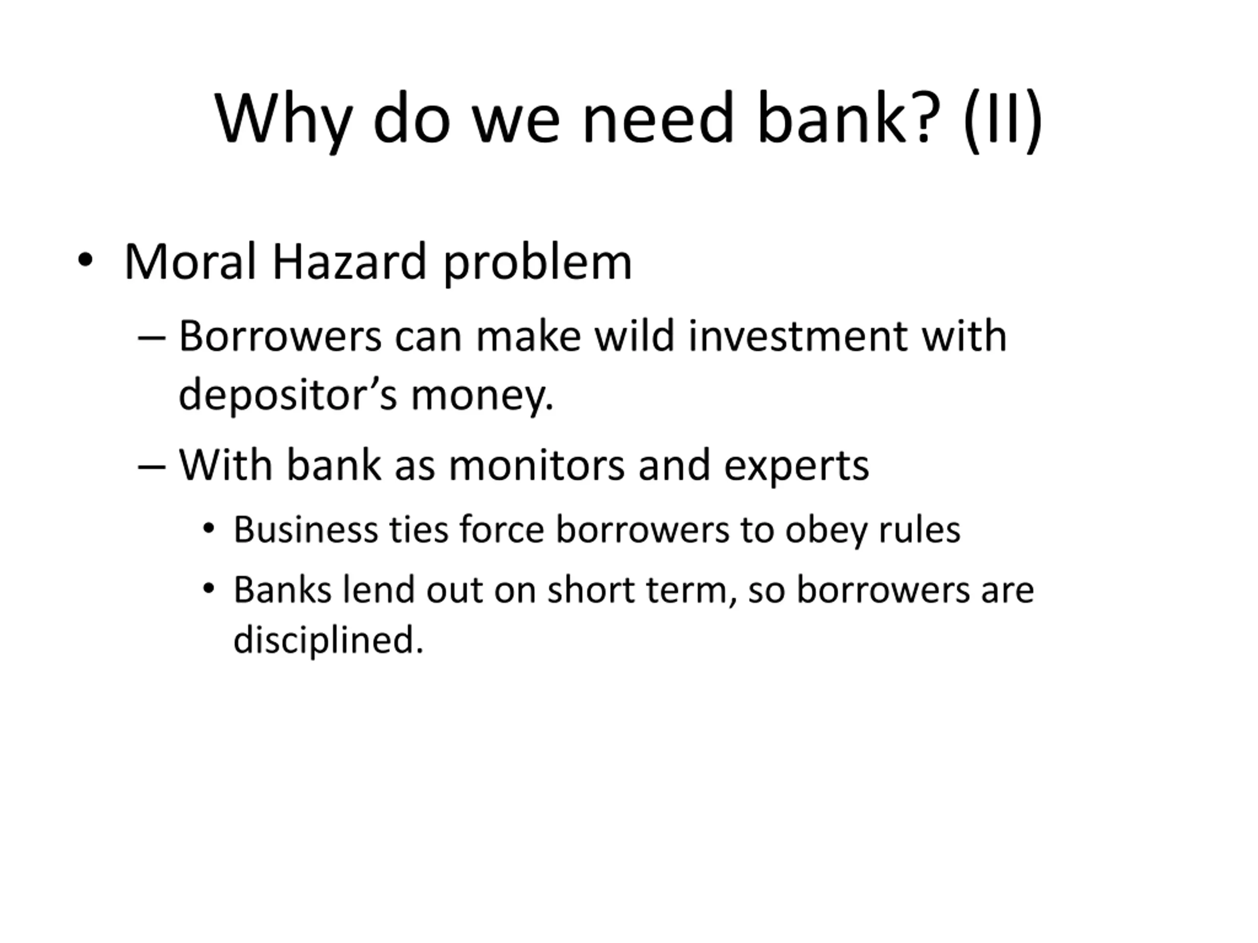 Why do we need bank? (II) Moral Hazard problem Borrowers can make wild investment with depositor s money. With bank as monitors and experts Business ties force borrowers to obey rules Banks lend out on short term, so borrowers are disciplined.