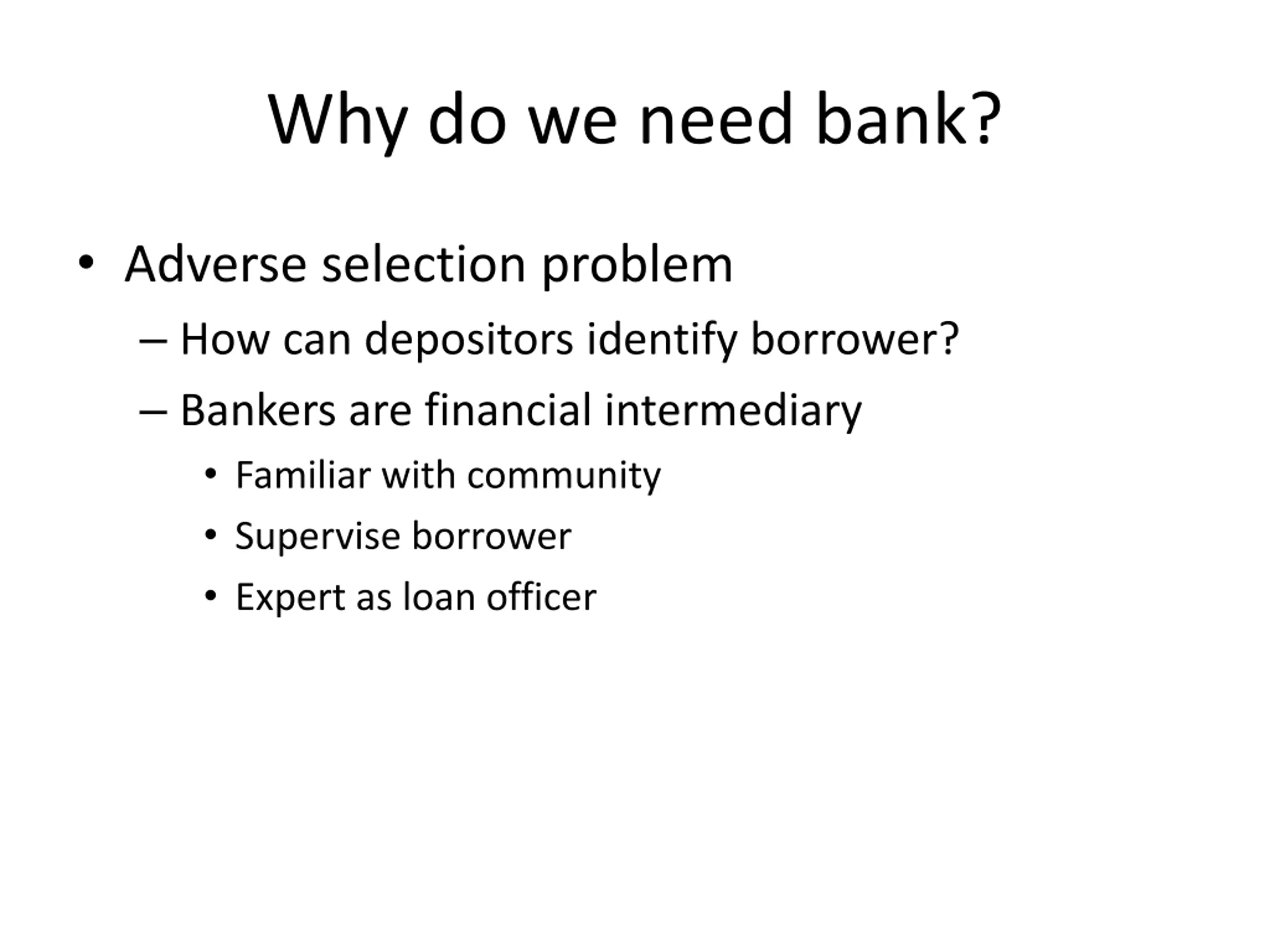 Why do we need bank? Adverse selection problem How can depositors identify borrower? Bankers are financial intermediary Familiar with community Supervise borrower Expert as loan officer