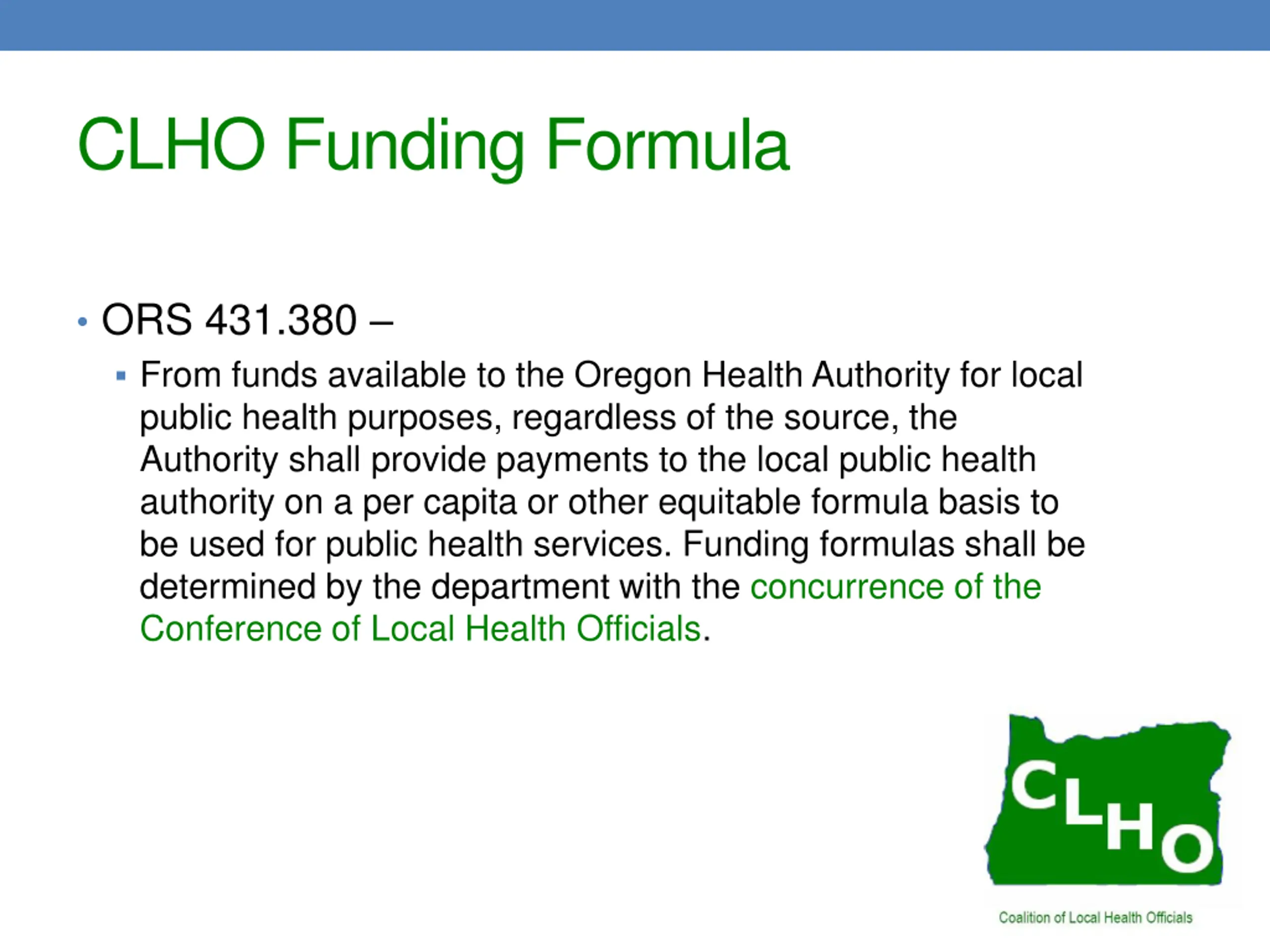 CLHO Funding Formula ORS 431.380 From funds available to the Oregon Health Authority for local public health purposes, regardless of the source, the Authority shall provide payments to the local public health authority on a per capita or other equitable formula basis to be used for public health services. Funding formulas shall be determined by the department with the concurrence of the Conference of Local Health Officials.