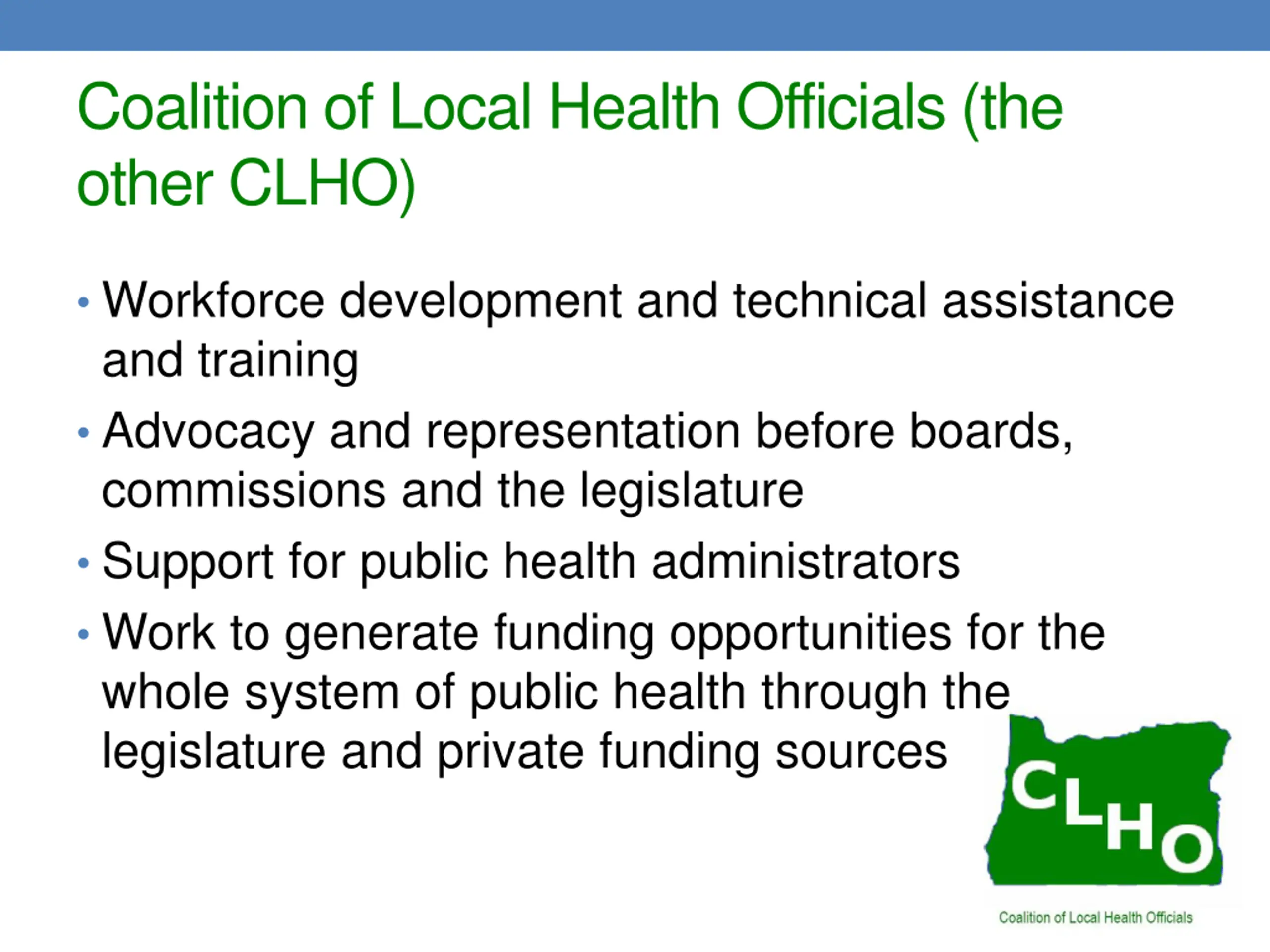 Coalition of Local Health Officials (the other CLHO) Workforce development and technical assistance and training Advocacy and representation before boards, commissions and the legislature Support for public health administrators Work to generate funding opportunities for the whole system of public health through the legislature and private funding sources