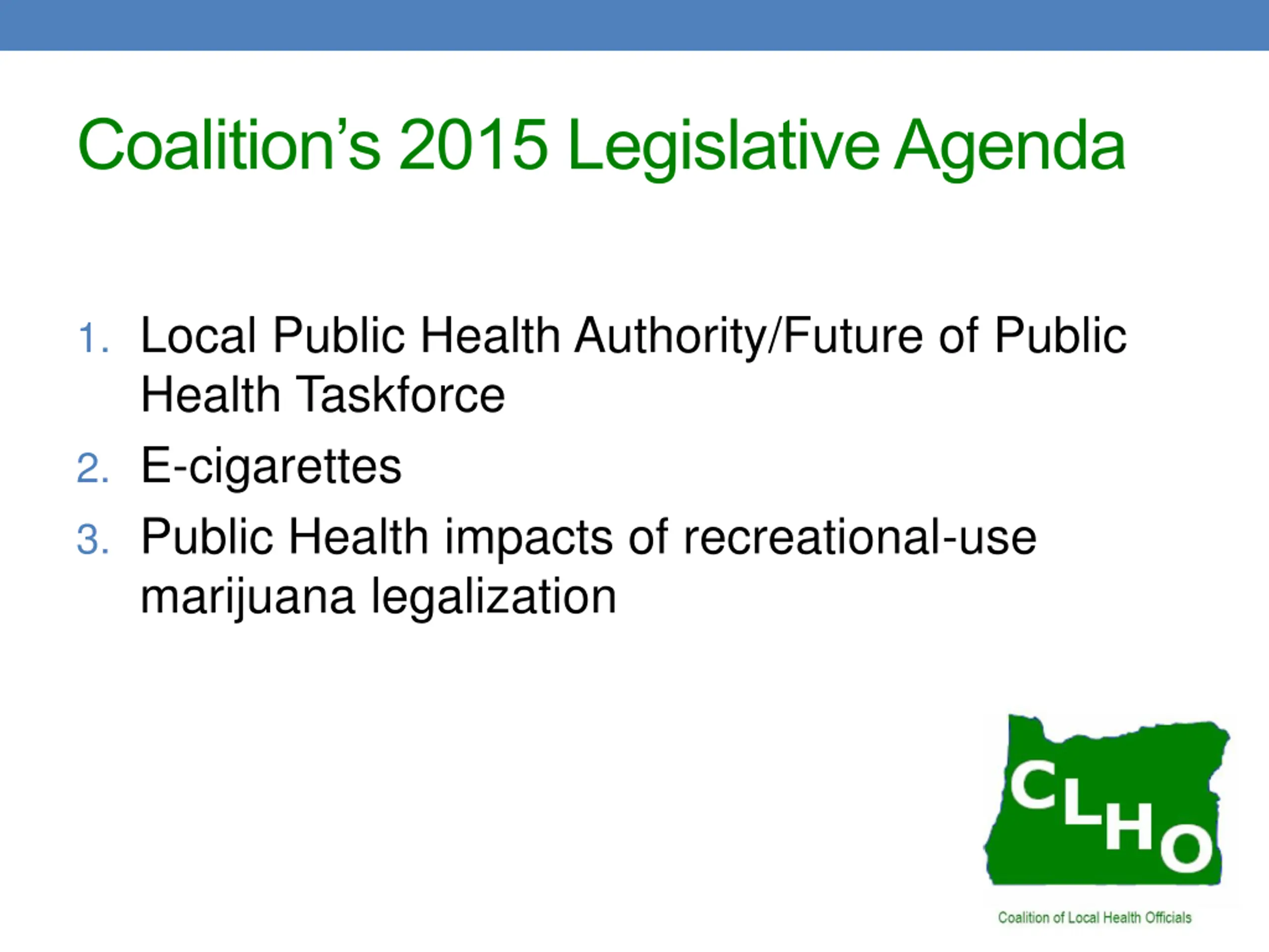Coalitions 2015 Legislative Agenda 1. Local Public Health Authority/Future of Public Health Taskforce 2. E-cigarettes 3. Public Health impacts of recreational-use marijuana legalization