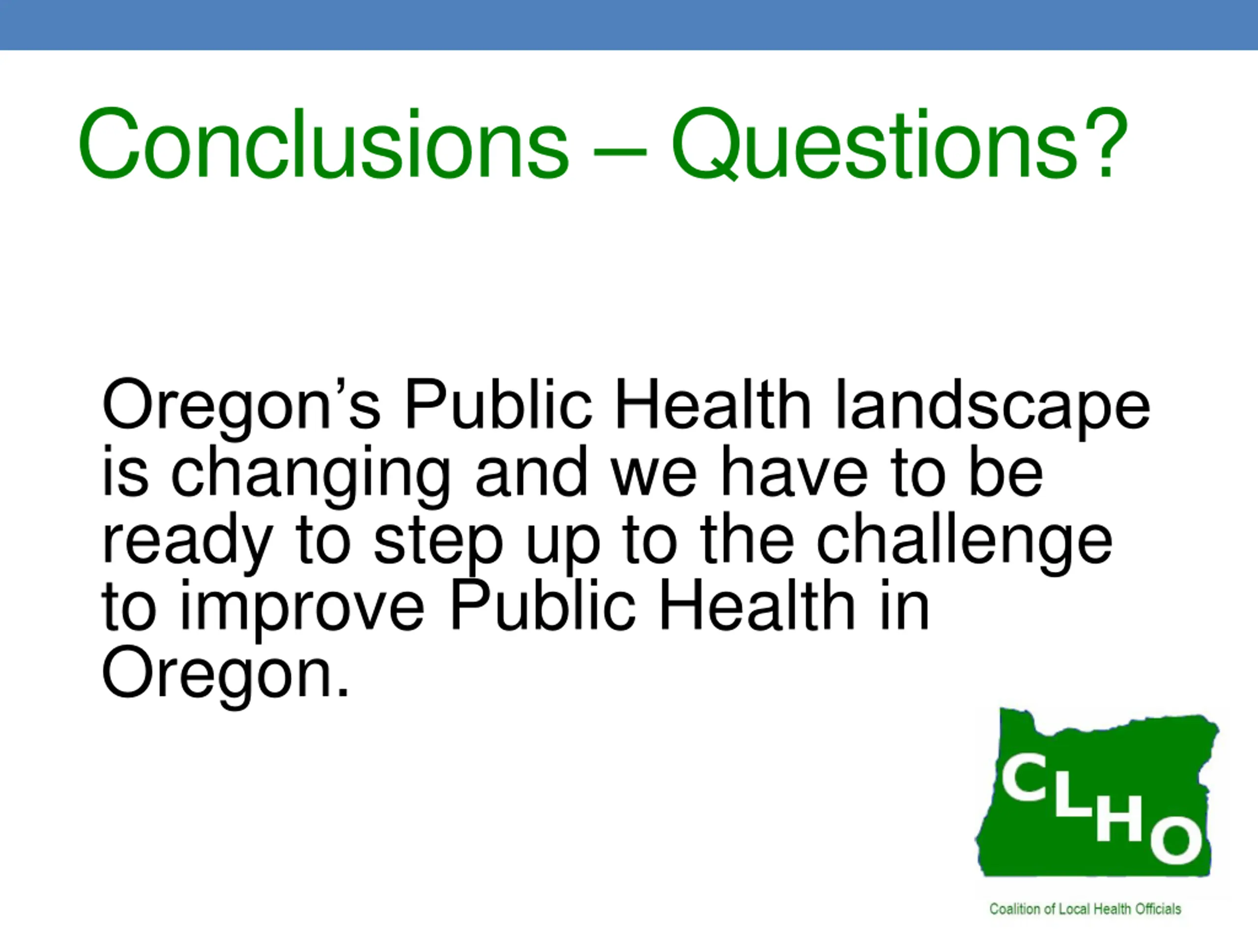 Conclusions Questions? Oregon s Public Health landscape is changing and we have to be ready to step up to the challenge to improve Public Health in Oregon.