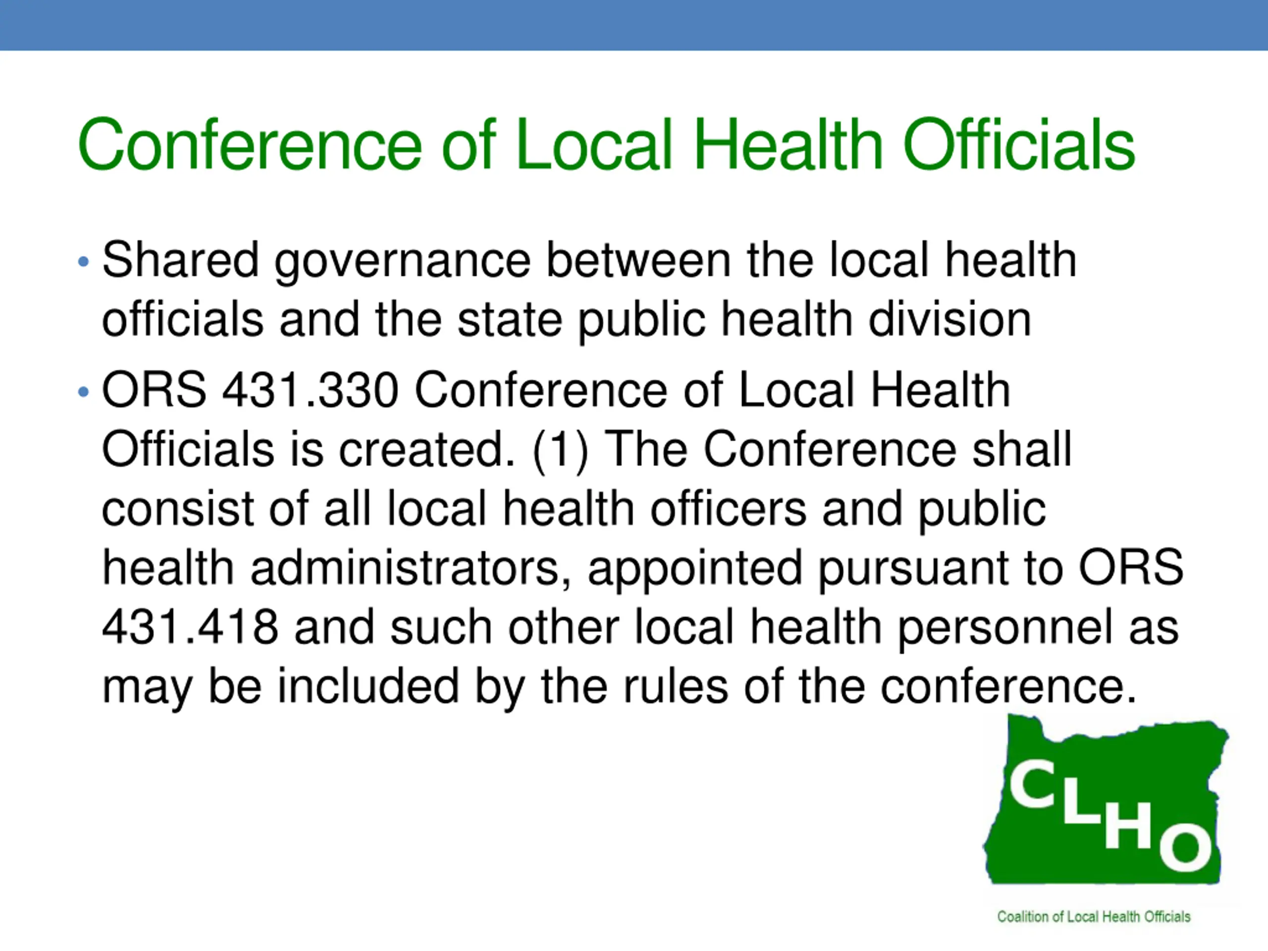 Conference of Local Health Officials Shared governance between the local health officials and the state public health division ORS 431.330 Conference of Local Health Officials is created. (1) The Conference shall consist of all local health officers and public health administrators, appointed pursuant to ORS 431.418 and such other local health personnel as may be included by the rules of the conference.