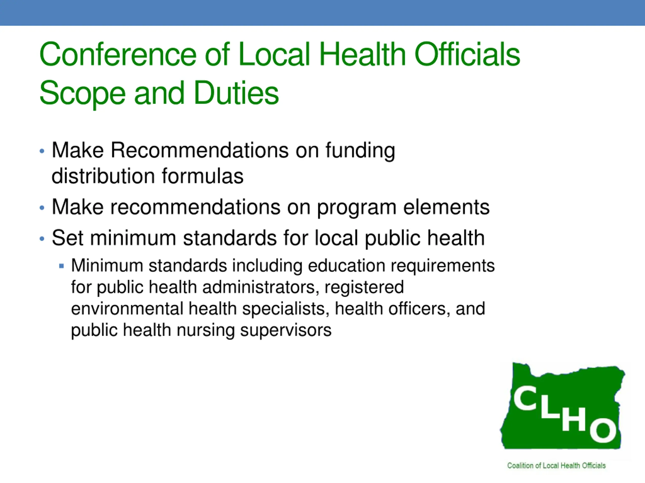Conference of Local Health Officials Scope and Duties Make Recommendations on funding distribution formulas Make recommendations on program elements Set minimum standards for local public health Minimum standards including education requirements for public health administrators, registered environmental health specialists, health officers, and public health nursing supervisors